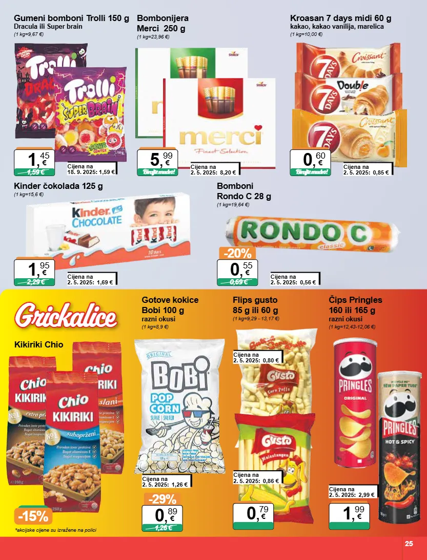 cijena na 2. 5. 2025: 8,20 € cijena na 18. 9. 2025: 1,59 € cijena na 2. 5. 2025: 1,69 € cijena na 2. 5. 2025: 0,56 € cijena na 2. 5. 2025: 0,85 € *akcijske cijene su izražene na polici -15% cijena na 2. 5. 2025: 0,80 € cijena na 2. 5. 2025: 0,86 € cijena na 2. 5. 2025: 1,26 € cijena na 2. 5. 2025: 2,99 € bombonijera merci 250 g (1 kg=23,96 €) birajte mudro! 5 , 99 € gumeni bomboni trolli 150 g dracula ili super brain (1 kg=9,67 €) 1,59 € 1 , 45 € kinder čokolada 125 g (1 kg=15,6 €) 2,29 € 1 , 95 € bomboni rondo c 28 g (1 kg=19,64 €) -20% 0,69 € 0 , 55 € kroasan 7 days midi 60 g kakao, kakao vanilija, marelica (1 kg=10,00 €) birajte mudro! 0 , 60 € flips gusto 85 g ili 60 g (1 kg=9,29 - 13,17 €) 0 , 79 € gotove kokice bobi 100 g razni okusi (1 kg=8,9 €) -29% 1,26 € 0 , 89 € kikiriki chio čips pringles 160 ili 165 g razni okusi (1 kg=12,43-12,06 €) 1 , 99 € 25 grickalice grickalice