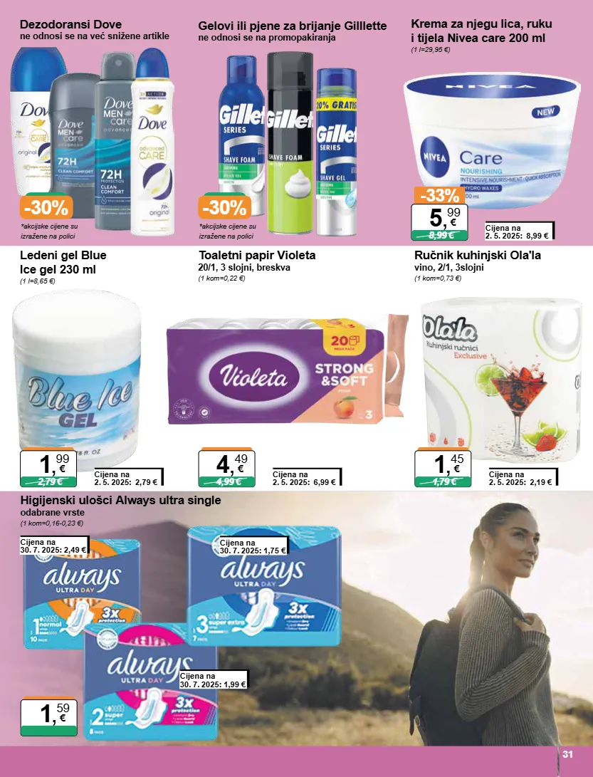 *akcijske cijene su izražene na polici -30% *akcijske cijene su izražene na polici -30% cijena na 2. 5. 2025: 2,79 € cijena na 2. 5. 2025: 8,99 € cijena na 2. 5. 2025: 6,99 € cijena na 2. 5. 2025: 2,19 € cijena na 30. 7. 2025: 2,49 € cijena na 30. 7. 2025: 1,99 € cijena na 30. 7. 2025: 1,75 € ledeni gel blue ice gel 230 ml (1 l=8,65 €) 2,79 € 1 , 99 € krema za njegu lica, ruku i tijela nivea care 200 ml (1 l=29,95 €) -33% 8,99 € 5 , 99 € gelovi ili pjene za brijanje gilllette ne odnosi se na promopakiranja dezodoransi dove ne odnosi se na već snižene artikle toaletni papir violeta 20/1, 3 slojni, breskva (1 kom=0,22 €) 4,99 € 4 , 49 € ručnik kuhinjski ola'la vino, 2/1, 3slojni (1 kom=0,73 €) 1,79 € 1 , 45 € higijenski ulošci always ultra single odabrane vrste (1 kom=0,16-0,23 €) 1 , 59 € 31