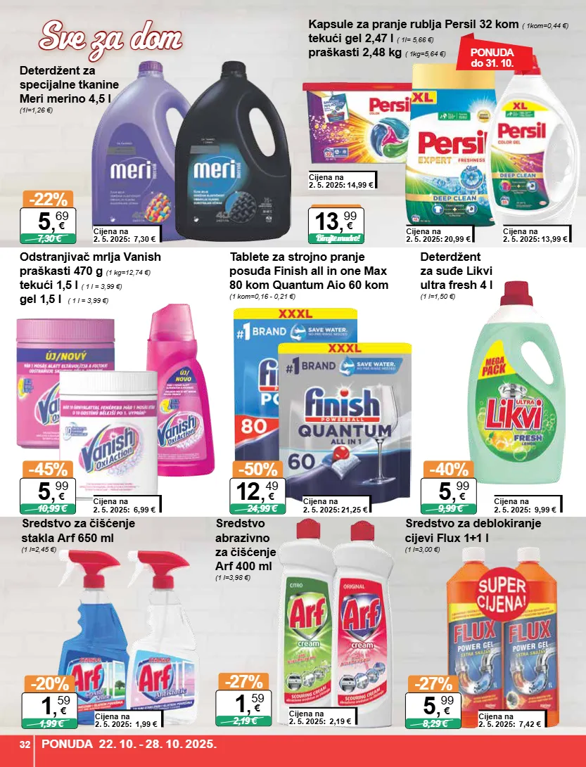 cijena na 2. 5. 2025: 7,42 € cijena na 2. 5. 2025: 7,30 € cijena na 2. 5. 2025: 14,99 € cijena na 2. 5. 2025: 13,99 € cijena na 2. 5. 2025: 20,99 € cijena na 2. 5. 2025: 21,25 € cijena na 2. 5. 2025: 6,99 € cijena na 2. 5. 2025: 9,99 € cijena na 2. 5. 2025: 1,99 € cijena na 2. 5. 2025: 2,19 € sredstvo za deblokiranje cijevi flux 1+1 l (1 l=3,00 €) -27% 8,29 € 5 , 99 € deterdžent za specijalne tkanine meri merino 4,5 l (1l=1,26 €) -22% 7,30 € 5 , 69 € kapsule za pranje rublja persil 32 kom ( 1kom=0,44 €) tekući gel 2,47 l ( 1l= 5,66 €) praškasti 2,48 kg ( 1kg=5,64 €) birajte mudro! 13 , 99 € tablete za strojno pranje posuđa finish all in one max 80 kom quantum aio 60 kom (1 kom=0,16 - 0,21 €) -50% 24,99 € 12 , 49 € odstranjivač mrlja vanish praškasti 470 g (1 kg=12,74 €) tekući 1,5 l ( 1 l = 3,99 €) gel 1,5 l ( 1 l = 3,99 €) -45% 10,99 € 5 , 99 € ponuda do 31. 10. deterdžent za suđe likvi ultra fresh 4 l (1 l=1,50 €) -40% 9,99 € 5 , 99 € sredstvo za čišćenje stakla arf 650 ml (1 l=2,45 €) -20% 1,99 € 1 , 59 € sredstvo abrazivno za čišćenje arf 400 ml (1 l=3,98 €) -27% 2,19 € 1 , 59 € ponuda 22. 10. - 28. 10. 2025. 32 sve za dom sve za dom