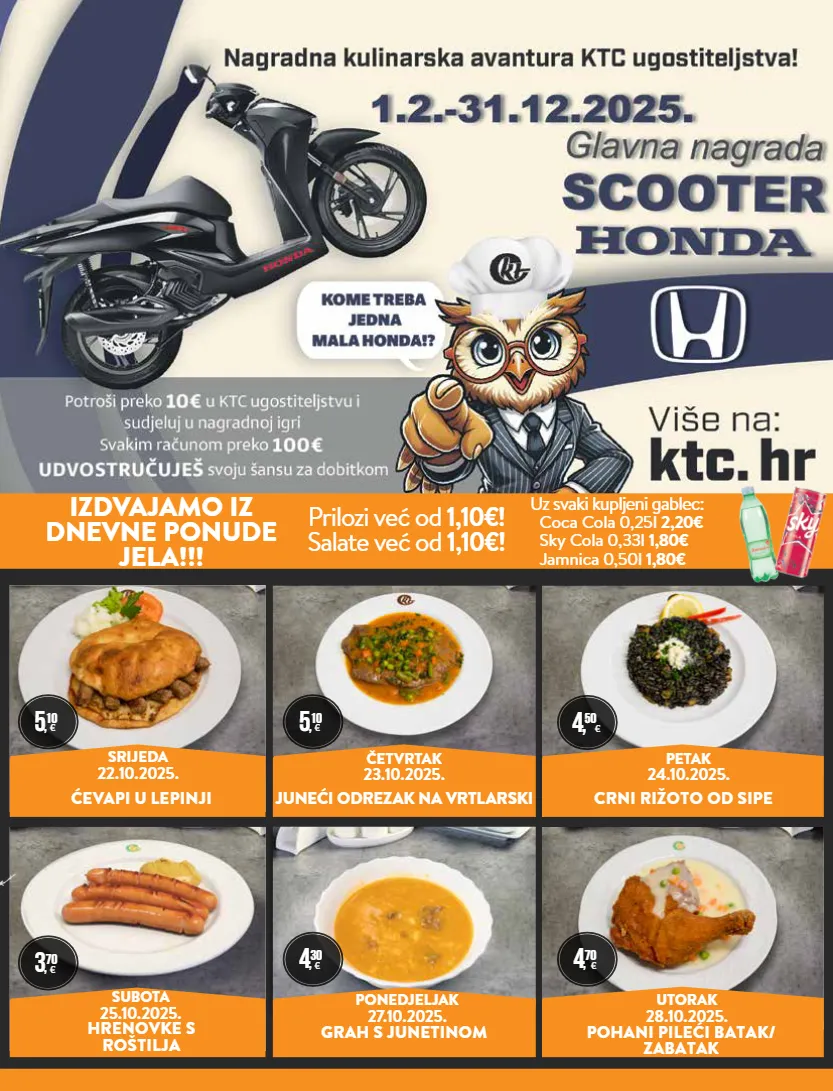 kn četvrtak 23.10.2025. zelena tjestenina s plodovima mora utorak 28.10.2025. ponedjeljak 27.10.2025. subota 25.10.2025. grah s junetinom pohani pileći batak/ zabatak hrenovke s roštilja izdvajamo iz dnevne ponude jela!!! petak 24.10.2025. crni rižoto od sipe 5 , 10 € 5 , 10 € 3 , 70 € 4, 50 € 4 , 70 € srijeda 22.10.2025. juneći odrezak na vrtlarski ćevapi u lepinji coca cola 0,25l 2,20€ sky cola 0,33l 1,80€ jamnica 0,50l 1,80€ prilozi već od 1,10€! salate već od 1,10€! uz svaki kupljeni gablec: 4 , 30 €