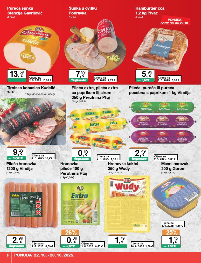 posebna ponuda subota 25. 10. 2025. cijena na 15. 10. 2025:15,99 € cijena na 2. 5. 2025: 5,99 € cijena na 2. 5. 2025: 1,29 € cijena na 2. 5. 2025: 4,18 € cijena na 2. 5. 2025: 3,49 € cijena na 2. 5. 2025: 0,65 € cijena na 2. 5. 2025: 6,99 € cijena na 2. 5. 2025: 9,99 € cijena na 2. 5. 2025: 2,65 € t pureća dimljena šunka perutnina ptuj (€ / kg) 15,99 € 12 , 99 € hamburger okrajci pivac (€ / kg) 3,49 € 2 , 99 € njoki l'antica mola 500 g (1 kg=2,18 €) 1,29 € 1 , 09 € lizalice 500 g (1 kg=3,90 €) 1 , 95 € flips 130g kanaan (1 kg=5 €) maska za kosu elseve 300 ml (1 l=13,30 €) -42% 6,99 € 3 , 99 € krema za lice loreal age specialist 50 ml (1 l=119,80 €) -40% 9,99 € 5 , 99 € krema aloe vera 200 ml (1 l=7,25 €) -45% 2,65 € 1 , 45 € 0 , 65 € 0,80 € posebna ponuda subota 25. 10. 2025. 13