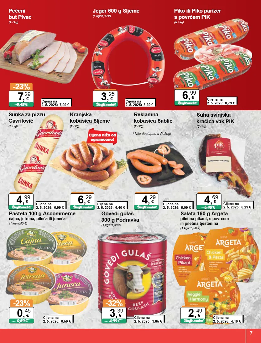 cijena na 2. 5. 2025: 4,19 € cijena na 2. 5. 2025: 3,85 € cijena na 2. 5. 2025: 5,99 € cijena na 2. 5. 2025: 0,59 € cijena na 2. 5. 2025: 6,99 € cijena na 2. 5. 2025: 7,99 € cijena na 2. 5. 2025: 6,40 € cijena na 2. 5. 2025: 6,29 € cijena na 2. 5. 2025: 8,79 € cijena na 2. 5. 2025: 3,29 € salata 160 g argeta piletina pikant, s povrćem ili piletina tjestenina (1 kg=15,56 €) birajte mudro! 2 , 49 € * nije dostupno u požegi goveđi gulaš 300 g podravka (1 kg=11,30 €) -32% 4,99 € 3 , 39 € reklamna kobasica sablić (€ / kg) birajte mudro! 4 , 29 € pašteta 100 g ascommerce čajna, jetrena, pileća ili juneća (1 kg=4,50 €) -23% 0,59 € 0 , 45 € šunka za pizzu gavrilović (€ / kg) birajte mudro! 4 , 99 € pečeni but pivac (€ / kg) -23% 9,49 € 7 , 29 € cijena niža od ograničene! kranjska kobasica sljeme (€ / kg) birajte mudro! 6 , 29 € suha svinjska kračica vak pik (€ / kg) 5,49 € 4 , 69 € piko ili piko parizer s povrćem pik (€ / kg) birajte mudro! 6 , 99 € jeger 600 g sljeme (1 kg=5,42 €) birajte mudro! 3 , 25 € 7