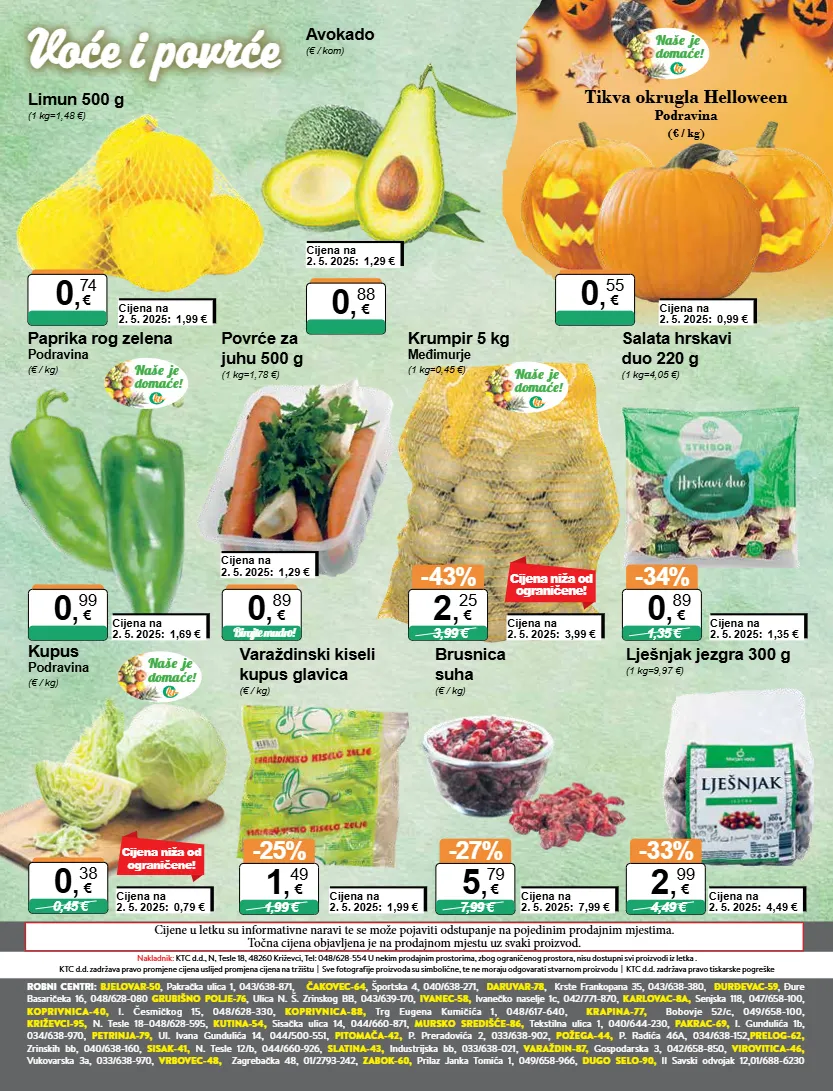 nakladnik: ktc d.d., n, tesle 18, 48260 križevci, tel: 048/628-554 u nekim prodajnim prostorima, zbog ograničenog prostora, nisu dostupni svi proizvodi iz letka . ktc d.d. zadržava pravo promjene cijena uslijed promjena cijena na tržištu | sve fotografije proizvoda su simbolične, te ne moraju odgovarati stvarnom proizvodu | ktc d.d. zadržava pravo tiskarske pogreške robni centri: bjelovar-50 , pakračka ulica 1, 043/638-871, čakovec-64 , športska 4, 040/638-271, daruvar-78 , krste frankopana 35, 043/638-380, đurđevac-59 , đure basaričeka 16, 048/628-080 grubišno polje-76 , ulica n. š. zrinskog bb, 043/639-170, ivanec-58, ivanečko naselje 1c, 042/771-870, karlovac-8a, senjska 118, 047/658-100, koprivnica-40, i. česmičkog 15, 048/628-330, koprivnica-88, trg eugena kumičića 1, 048/617-640, krapina-77, bobovje 52/c, 049/658-100, križevci-95, n. tesle 18–048/628-595, kutina-54, sisačka ulica 14, 044/660-871, mursko središće-86, tekstilna ulica 1, 040/644-230, pakrac-69, i. gundulića 1b, 034/638-970, petrinja-79, ul. ivana gundulića 14, 044/500-551, pitomača-42, p. preradovića 2, 033/638-902, požega-44, p. radića 46a, 034/638-152, prelog-62, zrinskih bb, 040/638-160, sisak-41, n. tesle 12/b, 044/660-926, slatina-43, industrijska bb, 033/638-021, varaždin-87, gospodarska 3, 042/658-850, virovitica-46, vukovarska 3a, 033/638-970, vrbovec-48, zagrebačka 48, 01/2793-242, zabok-60, prilaz janka tomića 1, 049/658-966, dugo selo-90, ii savski odvojak 12,01/688-6230 cijene u letku su informativne naravi te se može pojaviti odstupanje na pojedinim prodajnim mjestima. točna cijena objavljena je na prodajnom mjestu uz svaki proizvod. cijena na 2. 5. 2025: 7,99 € cijena na 2. 5. 2025: 4,49 € cijena na 2. 5. 2025: 1,99 € cijena na 2. 5. 2025: 1,35 € cijena na 2. 5. 2025: 1,29 € cijena na 2. 5. 2025: 0,99 € cijena na 2. 5. 2025: 3,99 € cijena na 2. 5. 2025: 1,69 € cijena na 2. 5. 2025: 1,99 € cijena na 2. 5. 2025: 1,29 € brusnica suha (€ / kg) -27% 7,99 € 5 , 79 € lješnjak jezgra 300 g (1 kg=9,97 €) -33% 4,49 € 2 , 99 € varaždinski kiseli kupus glavica (€ / kg) -25% 1,99 € 1 , 49 € cijena niža od ograničene! naše je domaće! naše je domaće! naše je domaće! naše je domaće! salata hrskavi duo 220 g (1 kg=4,05 €) -34% 1,35 € 0 , 89 € povrće za juhu 500 g (1 kg=1,78 €) birajte mudro! 0 , 89 € tikva okrugla helloween podravina (€ / kg) 0 , 55 € krumpir 5 kg međimurje (1 kg=0,45 €) -43% 3,99 € 2 , 25 € paprika rog zelena podravina (€ / kg) 0 , 99 € kupus podravina (€ / kg) cijena na 2. 5. 2025: 0,79 € cijena niža od ograničene! 0,45 € 0 , 38 € limun 500 g (1 kg=1,48 €) 0 , 74 € avokado (€ / kom) 0 , 88 € voće i povrće
