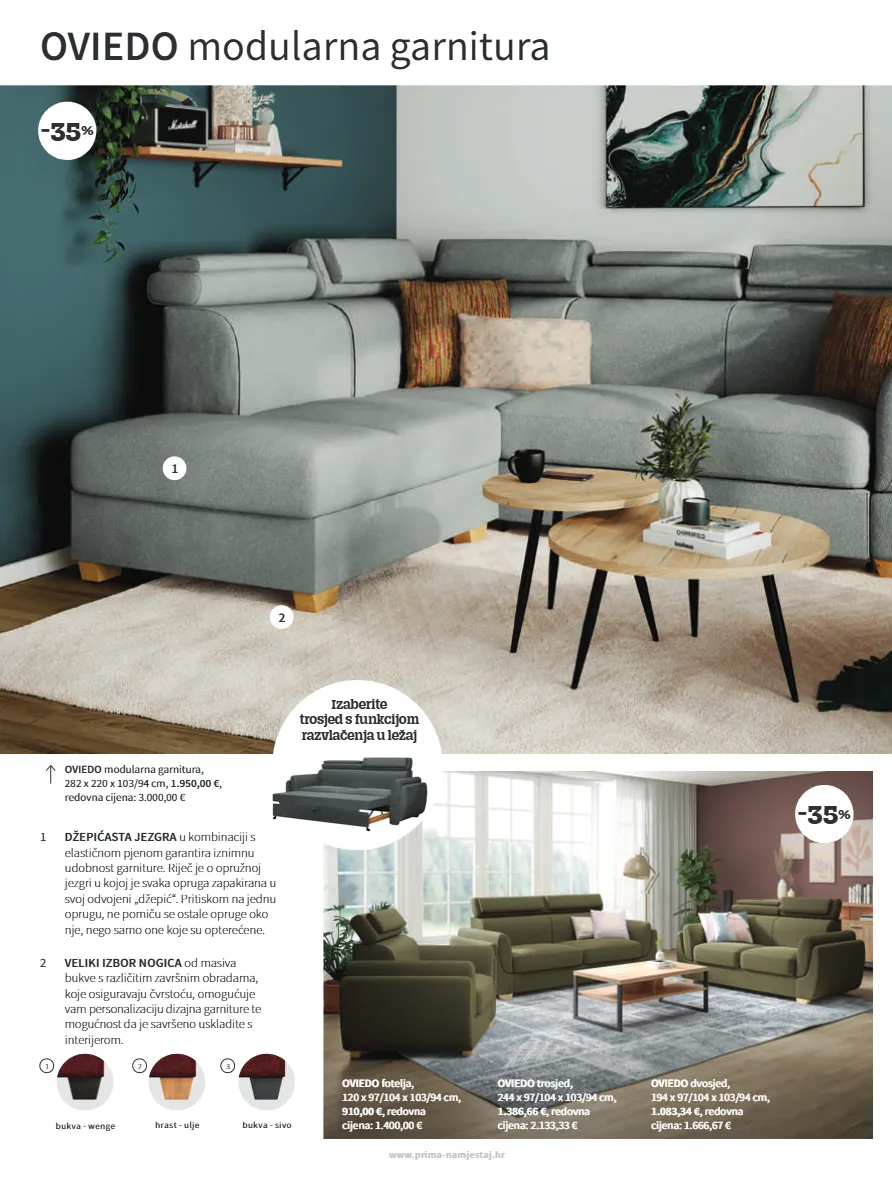 www.prima-namjestaj.hr modu 1 2 1 džepićasta jezgra u kombinaciji s elastičnom pjenom garantira iznimnu udobnost garniture. riječ je o opružnoj jezgri u kojoj je svaka opruga zapakirana u svoj odvojeni „džepić“. pritiskom na jednu oprugu, ne pomiču se ostale opruge oko nje, nego samo one koje su opterećene. 2 veliki izbor nogica od masiva bukve s različitim završnim obradama, koje osiguravaju čvrstoću, omogućuje vam personalizaciju dizajna garniture te mogućnost da je savršeno uskladite s interijerom. 1 3 2 bukva - wenge hrast - ulje bukva - sivo izaberite trosjed s funkcijom razvlačenja u ležaj oviedo modularna garnitura oviedo modularna garnitura, 282 x 220 x 103/94 cm, 1.950,00 € , redovna cijena: 3.000,00 € oviedo trosjed, 244 x 97/104 x 103/94 cm, 1.386,66 € , redovna cijena: 2.133,33 € oviedo dvosjed, 194 x 97/104 x 103/94 cm, 1.083,34 € , redovna cijena: 1.666,67 € oviedo fotelja, 120 x 97/104 x 103/94 cm, 910,00 € , redovna cijena: 1.400,00 € - 35 % - 35 %