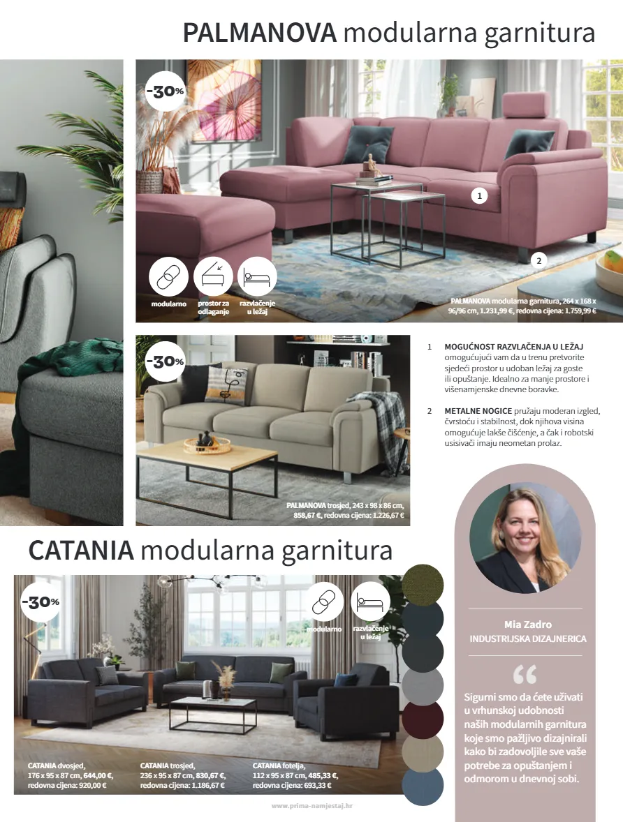 www.prima-namjestaj.hr 1 2 mogućnost razvlačenja u ležaj omogućujući vam da u trenu pretvorite sjedeći prostor u udoban ležaj za goste ili opuštanje. idealno za manje prostore i višenamjenske dnevne boravke. 1 metalne nogice pružaju moderan izgled, čvrstoću i stabilnost, dok njihova visina omogućuje lakše čišćenje, a čak i robotski usisivači imaju neometan prolaz. 2 razvlačenje u ležaj prostor za odlaganje ularno razvlačenje u ležaj prostor za odlaganje modularno razvlačenje u ležaj modularno sigurni smo da ćete uživati u vrhunskoj udobnosti naših modularnih garnitura koje smo pažljivo dizajnirali kako bi zadovoljile sve vaše potrebe za opuštanjem i odmorom u dnevnoj sobi. “ mia zadro industrijska dizajnerica catania modularna garnitura palmanova modularna garnitura catania dvosjed, 176 x 95 x 87 cm, 644,00 € , redovna cijena: 920,00 € catania trosjed, 236 x 95 x 87 cm, 830,67 € , redovna cijena: 1.186,67 € catania fotelja, 112 x 95 x 87 cm, 485,33 € , redovna cijena: 693,33 € - 30 % - 30 % - 30 % palmanova trosjed, 243 x 98 x 86 cm, 858,67 € , redovna cijena: 1.226,67 € palmanova modularna garnitura , 264 x 168 x 96/96 cm, 1.231,99 € , redovna cijena: 1.759,99 €