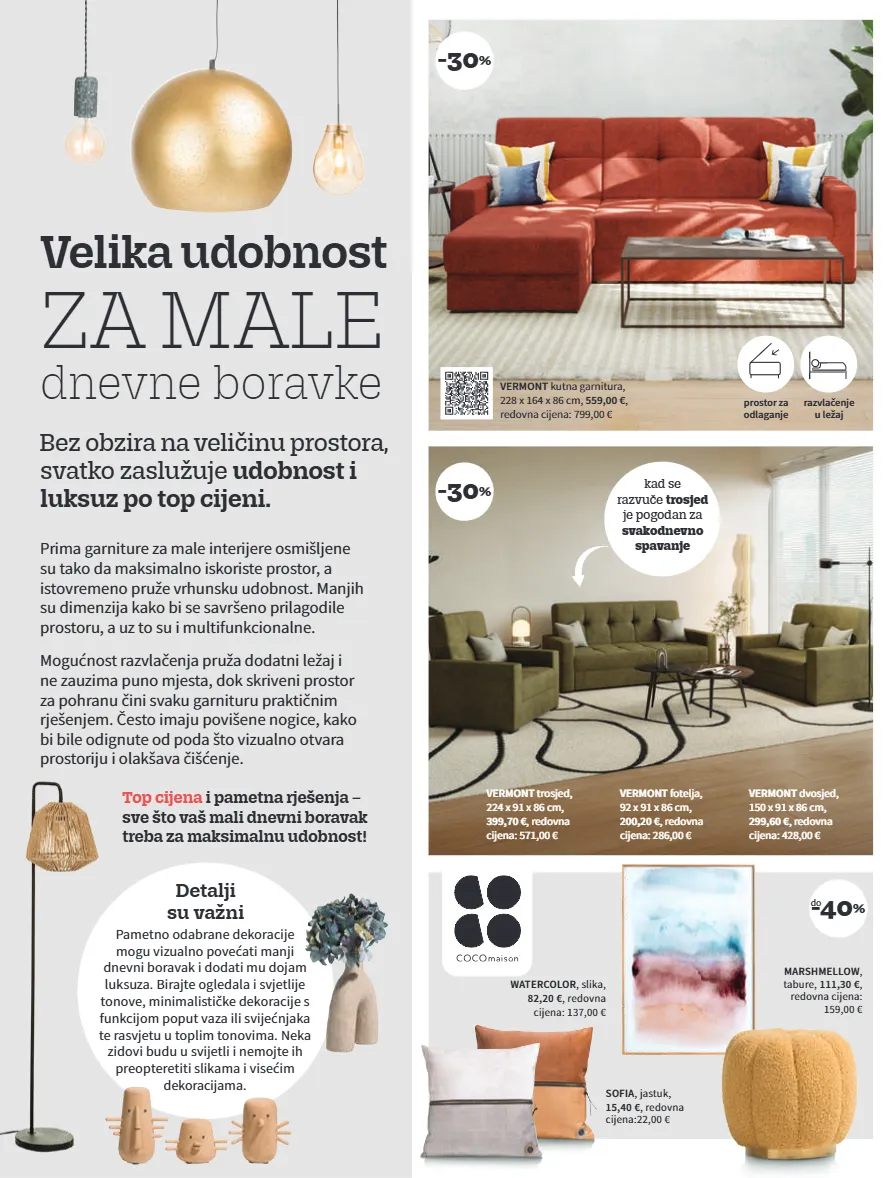 bez obzira na veličinu prostora, svatko zaslužuje udobnost i luksuz po top cijeni. detalji su važni pametno odabrane dekoracije mogu vizualno povećati manji dnevni boravak i dodati mu dojam luksuza. birajte ogledala i svjetlije tonove, minimalističke dekoracije s funkcijom poput vaza ili svijećnjaka te rasvjetu u toplim tonovima. neka zidovi budu u svijetli i nemojte ih preopteretiti slikama i visećim dekoracijama. kad se razvuče trosjed je pogodan za svakodnevno spavanje vermont trosjed, 224 x 91 x 86 cm, 399,70 € , redovna cijena: 571,00 € vermont fotelja, 92 x 91 x 86 cm, 200,20 € , redovna cijena: 286,00 € vermont dvosjed, 150 x 91 x 86 cm, 299,60 € , redovna cijena: 428,00 € vermont kutna garnitura, 228 x 164 x 86 cm, 559,00 € , redovna cijena: 799,00 € velika udobnost za male dnevne boravke sofia , jastuk, 15,40 € , redovna cijena:22,00 € watercolor , slika, 82,20 € , redovna cijena: 137,00 € marshmellow , tabure, 111,30 € , redovna cijena: 159,00 € razvlačenje u ležaj prostor za odlaganje - 30 % - 30 % - 40 % do prima garniture za male interijere osmišljene su tako da maksimalno iskoriste prostor, a istovremeno pruže vrhunsku udobnost. manjih su dimenzija kako bi se savršeno prilagodile prostoru, a uz to su i multifunkcionalne. mogućnost razvlačenja pruža dodatni ležaj i ne zauzima puno mjesta, dok skriveni prostor za pohranu čini svaku garnituru praktičnim rješenjem. često imaju povišene nogice, kako bi bile odignute od poda što vizualno otvara prostoriju i olakšava čišćenje. top cijena i pametna rješenja – sve što vaš mali dnevni boravak treba za maksimalnu udobnost!