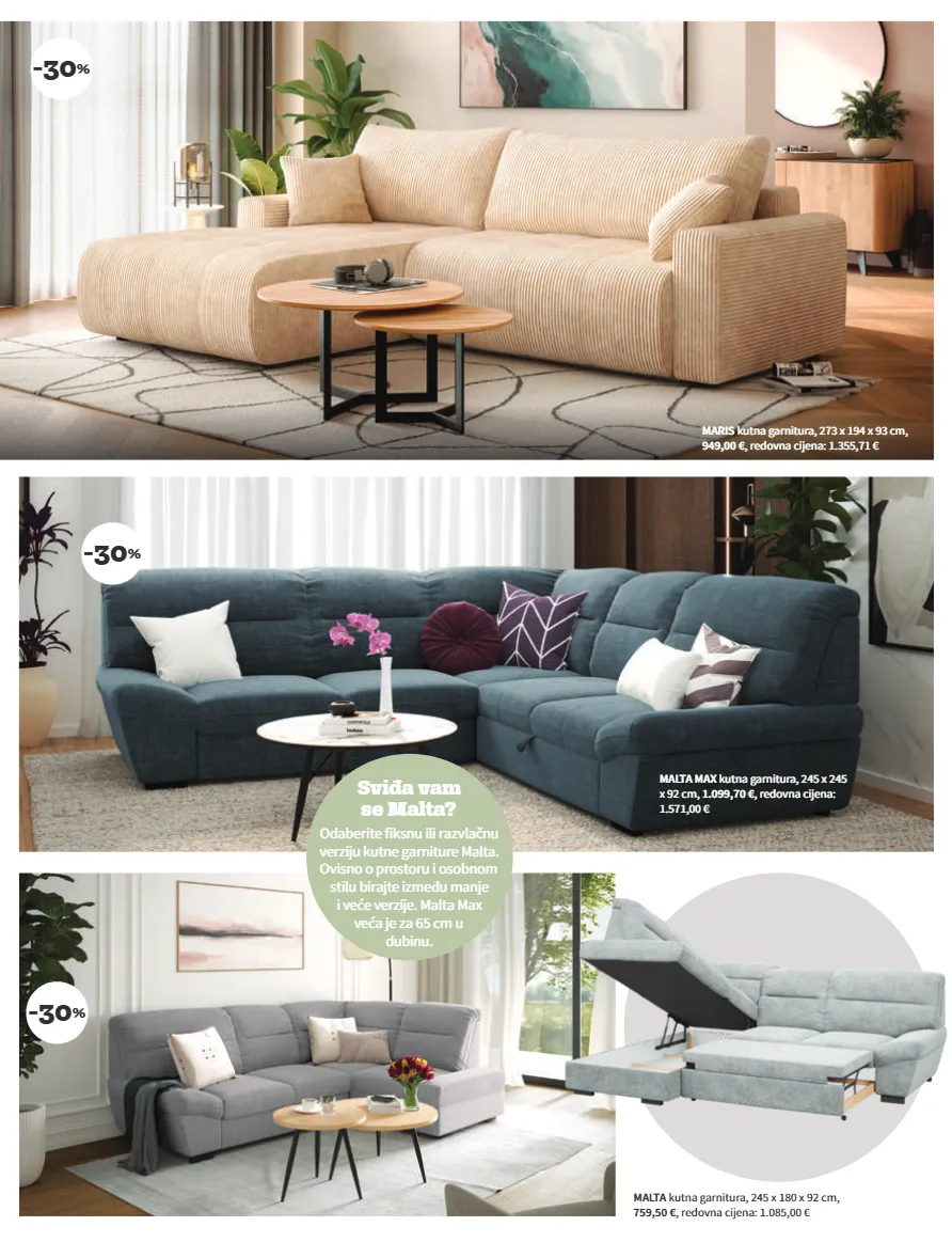 maris kutna garnitura, 273 x 194 x 93 cm, 949,00 € , redovna cijena: 1.355,71 € malta max kutna garnitura, 245 x 245 x 92 cm, 1.099,70 € , redovna cijena: 1.571,00 € sviđa vam se malta? odaberite fiksnu ili razvlačnu verziju kutne garniture malta. ovisno o prostoru i osobnom stilu birajte između manje i veće verzije. malta max veća je za 65 cm u dubinu. - 30 % - 30 % - 30 % malta kutna garnitura, 245 x 180 x 92 cm, 759,50 € , redovna cijena: 1.085,00 €