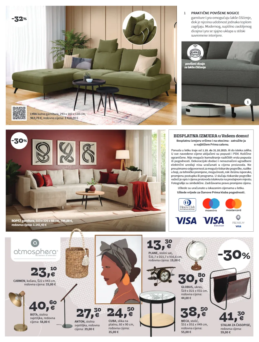 24, 50 € cuba , slika na platnu, 60 x 90 cm, redovna cijena: 35,00 € 38, 50 € meca , stolić, š51 x d51 x v49 cm, redovna cijena: 55,00 € 30, 80 € globus, ukras, š19 x d21 x v31 cm, redovna cijena: 44,00 € 13, 30 € plane, stolni sat , š31,7 x d21,7 x v16,6 cm, redovna cijena: 19,00 € 41, 30 € stalak za časopise, redovna cijena: 59,00 € - 30 % 1 povišeni dizajn za lakše čišćenje lyra kutna garnitura, 293 x 183 x 110 cm, 963,79 € , redovna cijena: 1.428,00 € - 32 % ropez garnitura, 313 x 225 x 88 cm, 799,00 € , redovna cijena: 1.141,43 € - 30 % 23, 10 € carmen , košara, š22 x v43 cm, redovna cijena: 33,00 € 27, 30 € anton, stolna svjetiljka, redovna cijena: 39,00 € 40, 60 € bota, stolna svjetiljka, redovna cijena: 58,00 € uštede su uračunate u iskazanim cijenama u letku. uštede vrijede za članove prima kluba pogodnosti. besplatna izmjera u vašem domu! besplatnu izmjeru vršimo i na otocima - zatražite ju u najbližem prima salonu. ponuda u letku traje od 1.10. do 31.10.2025. ili do isteka zaliha. u sve navedene cijene uključeni su popusti i pdv. količine ograničene. nije moguće kumuliranje različitih vrsta popusta ili pogodnosti. dekoracijski dodaci i nenaznačeni ugradbeni električni uređaji nisu uračunati u cijenu proizvoda. ne preuzimamo odgovornost za moguće tiskarske pogreške, razlike u boji, za tehničke promjene, mogućnosti, rok i brzinu isporuke, promjenu postupka ili programa. u slučaju tiskarske pogreške važeći je opis i cijena proizvoda istaknuta na prodajnom mjestu. fotografije su simbolične. zadržavamo pravo promjene cijena. praktične povišene nogice garniture lyra omogućuju lakše čišćenje, dok je njezina udobnost jednaka toplom zagrljaju. modernog, suptilno zaobljenog dizajna lyra se sjajno uklapa u stilski suvremene interijere. 1