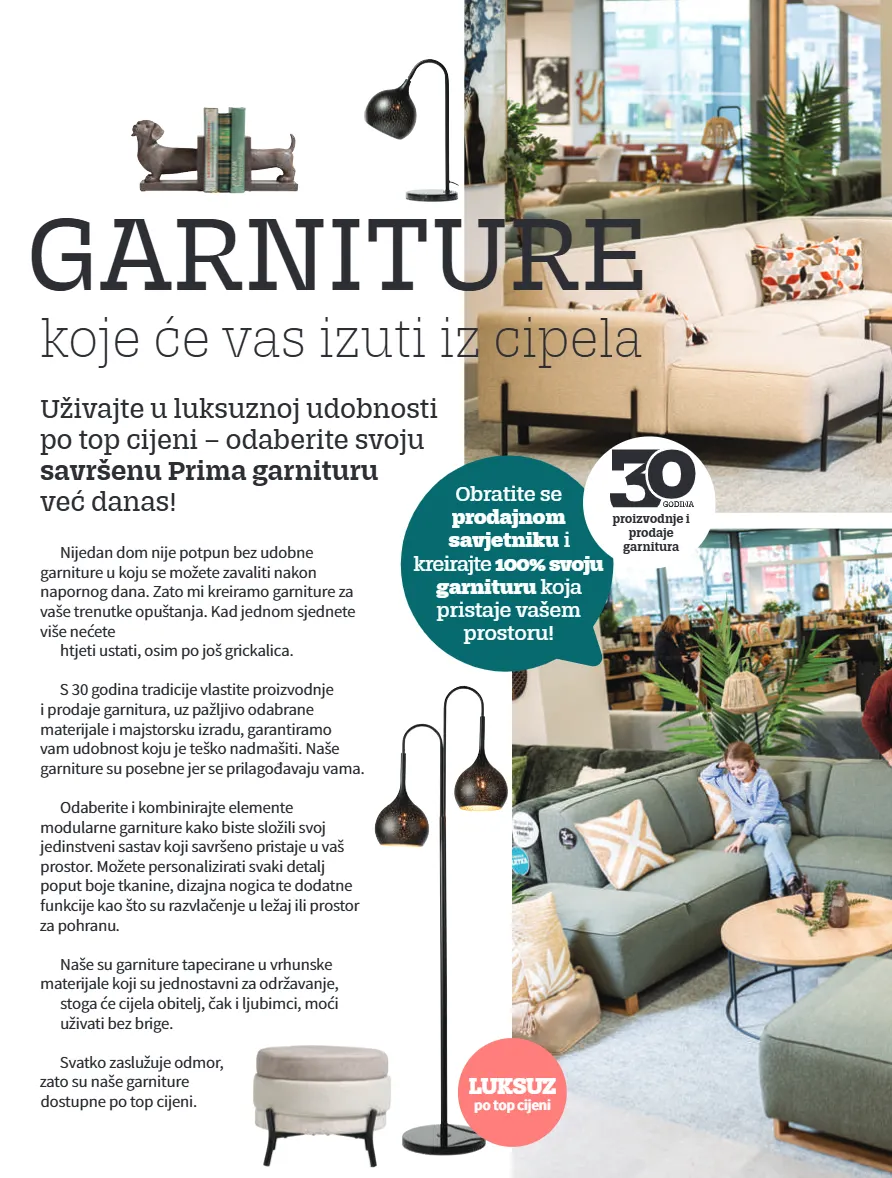 Uživajte u luksuznoj udobnosti po top cijeni – odaberite svoju savršenu Prima garnituru već danas! GARNITURE Obratite se prodajnom savjetniku i kreirajte 100% svoju garnituru koja pristaje vašem prostoru! Nijedan dom nije potpun bez udobne garniture u koju se možete zavaliti nakon napornog dana. Zato mi kreiramo garniture za vaše trenutke opuštanja. Kad jednom sjednete više nećete htjeti ustati, osim po još grickalica. S 30 godina tradicije vlastite proizvodnje i prodaje garnitura, uz pažljivo odabrane materijale i majstorsku izradu, garantiramo vam udobnost koju je teško nadmašiti. Naše garniture su posebne jer se prilagođavaju vama. Odaberite i kombinirajte elemente modularne garniture kako biste složili svoj jedinstveni sastav koji savršeno pristaje u vaš prostor. Možete personalizirati svaki detalj poput boje tkanine, dizajna nogica te dodatne funkcije kao što su razvlačenje u ležaj ili prostor za pohranu. Naše su garniture tapecirane u vrhunske materijale koji su jednostavni za održavanje, stoga će cijela obitelj, čak i ljubimci, moći uživati bez brige. Svatko zaslužuje odmor, zato su naše garniture dostupne po top cijeni. koje će vas izuti iz cipela proizvodnje i prodaje garnitura LUKSUZ po top cijeni