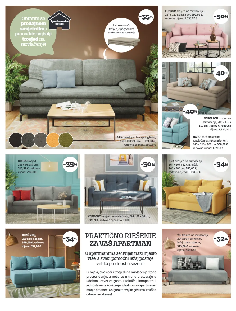 praktično rješenje za vaš apartman u apartmanima se uvijek traži mjesto više, a svaki pomoćni ležaj postaje velika prednost u sezoni! ležajevi, dvosjedi i trosjedi na razvlačenje štede prostor danju, a noću se u trenu pretvaraju u udoban krevet za goste. praktični, kompaktni i jednostavni za korištenje, idealni su za apartmane i manje prostore. osigurajte svojim gostima savršen odmor već danas! obratite se prodajnom savjetniku i pronađite najbolji trosjed na razvlačenje! brač ležaj, 200 x 89 x 86 cm, 349,00 € , redovna cijena: 532,00 € napoleon trosjed na razvlačenje s rukonaslonom, 245 x 110 x 100 cm, 958,88 € , redovna cijena: 1.598,67 € napoleon trosjed na razvlačenje, 208 x 110 x 110 cm, 798,93 € , redovna cijena: 1.332,00 € odesa trosjed, 231 x 96 x 87 cm, 513,52 € , redovna cijena: 799,00 € kad se razvuče trosjed je pogodan za svakodnevno spavanje aria preklopni box spring ležaj, 208 x 108 x 95 cm, 1.199,00 € , redovna cijena: 1.856,00 € lokrum trosjed na razvlačenje, 227 x 113 x 98/83 cm, 799,00 € , redovna cijena: 1.598,67 € vermont trosjed na razvlačenje, 224 x 91 x 86 cm, 399,70 € , redovna cijena: 571,00 € vis trosjed na razvlačenje, 204 x 93 x 88/78 cm, ležaj: 144 x 200 cm, 379,00 € , redovna cijena: 558,67 € krk dvosjed na razvlačenje, 164 x 107 x 92 cm, ležaj: 140 x 200 cm, 789,00 €, redovna cijena: 1.198,67 € apartmanska ponuda - 35 % - 50 % - 40 % - 34 % - 32 % - 30 % - 35 % - 34 % - 40 %