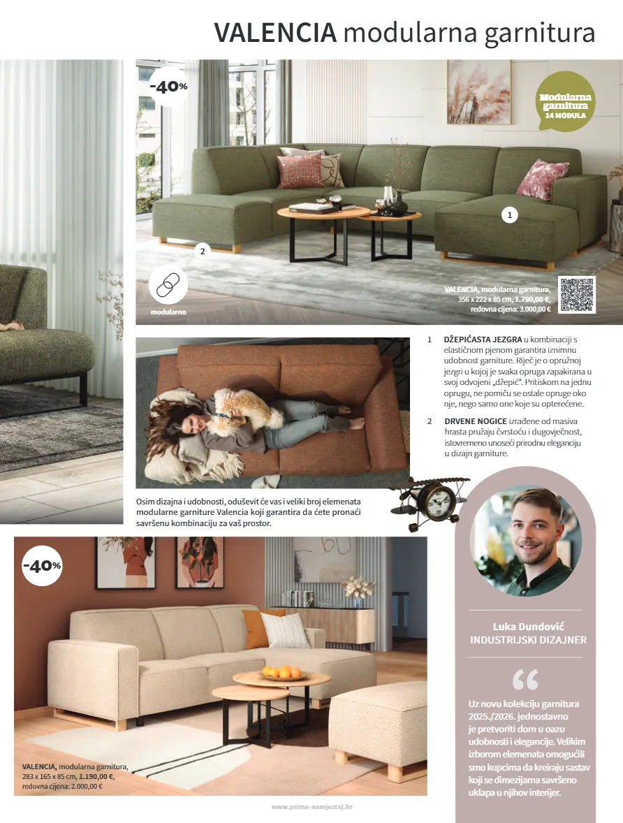 www.prima-namjestaj.hr Uz novu kolekciju garnitura 2025./2026. jednostavno je pretvoriti dom u oazu udobnosti i elegancije. Velikim izborom elemenata omogućili smo kupcima da kreiraju sastav koji se dimezijama savršeno uklapa u njihov interijer. “ Luka Dundović INDUSTRIJSKI DIZAJNER 1 2 DŽEPIĆASTA JEZGRA u kombinaciji s elastičnom pjenom garantira iznimnu udobnost garniture. Riječ je o opružnoj jezgri u kojoj je svaka opruga zapakirana u svoj odvojeni „džepić“. Pritiskom na jednu oprugu, ne pomiču se ostale opruge oko nje, nego samo one koje su opterećene. DRVENE NOGICE izrađene od masiva hrasta pružaju čvrstoću i dugovječnost, istovremeno unoseći prirodnu eleganciju u dizajn garniture. 2 1 Modularna garnitura 14 MODULA modularno modularno VALENCIA modularna garnitura Osim dizajna i udobnosti, oduševit će vas i veliki broj elemenata modularne garniture Valencia koji garantira da ćete pronaći savršenu kombinaciju za vaš prostor. VALENCIA, modularna garnitura , 356 x 222 x 85 cm, 1.790,00 € , redovna cijena: 3.000,00 € VALENCIA, modularna garnitura , 283 x 165 x 85 cm, 1.190,00 € , redovna cijena: 2.000,00 € - 40 % - 40 %