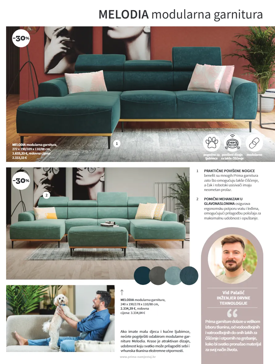 www.prima-namjestaj.hr POMIČNI MEHANIZAM U GLAVONASLONIMA osigurava ergonomsku potporu vratu i leđima, omogućujući prilagodbu položaja za maksimalnu udobnost i opuštanje. 2 PRAKTIČNE POVIŠENE NOGICE benefit su mnogih Prima garnitura zato što omogućuju lakše čišćenje, a čak i robotski usisivači imaju neometan prolaz. 1 2 1 modularno povišeni dizajn za lakše čišćenje Prima garniture dolaze u velikom izboru tkanina, od vodoodbojnih i vatroodbojnih do onih lakih za čišćenje i otpornih na grebanje, kako bi svatko pronašao materijal za svoj način života. “ Vid Palalić INŽENJER DRVNE TEHNOLOGIJE pogodno za ljubimce MELODIA modularna garnitura, 240 x 190/178 x 110/88 cm, 2.334,39 € , redovna cijena: 3.334,84 € MELODIA modularna garnitura, 272 x 190/109 x 110/88 cm, 1.633,33 € , redovna cijena: 2.333,33 € Ako imate malu djecu i kućne ljubimce, nećete pogriješiti odabirom modularne gar- niture Melodia. Krase je atraktivan dizajn, udobnost koju svatko može prilagoditi sebi i vrhunska tkanina ekstremne otpornosti. - 30 % - 30 % MELODIA modularna garnitura