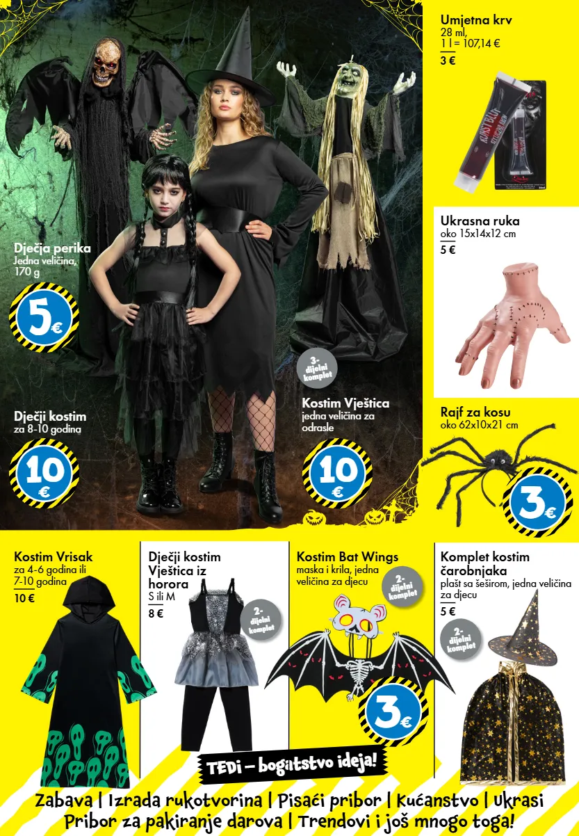 Zabava | Izrada rukotvorina | Pisaći pribor | Kućanstvo | Ukrasi Pribor za pakiranje darova | Trendovi i još mnogo toga! TEDi – bogatstvo ideja! Zabava | Izrada rukotvorina | Pisaći pribor | Kućanstvo | Ukrasi Pribor za pakiranje darova | Trendovi i još mnogo toga! Dječja perika Jedna veličina, 170 g Umjetna krv 28 ml, 1 l = 107,14 € 3 € Kostim Bat Wings maska i krila, jedna veličina za djecu Dječji kostim za 8-10 godina Kostim Vještica jedna veličina za odrasle Ukrasna ruka oko 15x14x12 cm 5 € Rajf za kosu oko 62x10x21 cm Kostim Vrisak za 4-6 godina ili 7-10 godina 10 € 5 € 10 € 10 € Dječji kostim Vještica iz horora S ili M 8 € Komplet kostim čarobnjaka plašt sa šeširom, jedna veličina za djecu 5 € 2- dijelni komplet 2- dijelni komplet 2- dijelni komplet 3 € 3- dijelni komplet 3 €