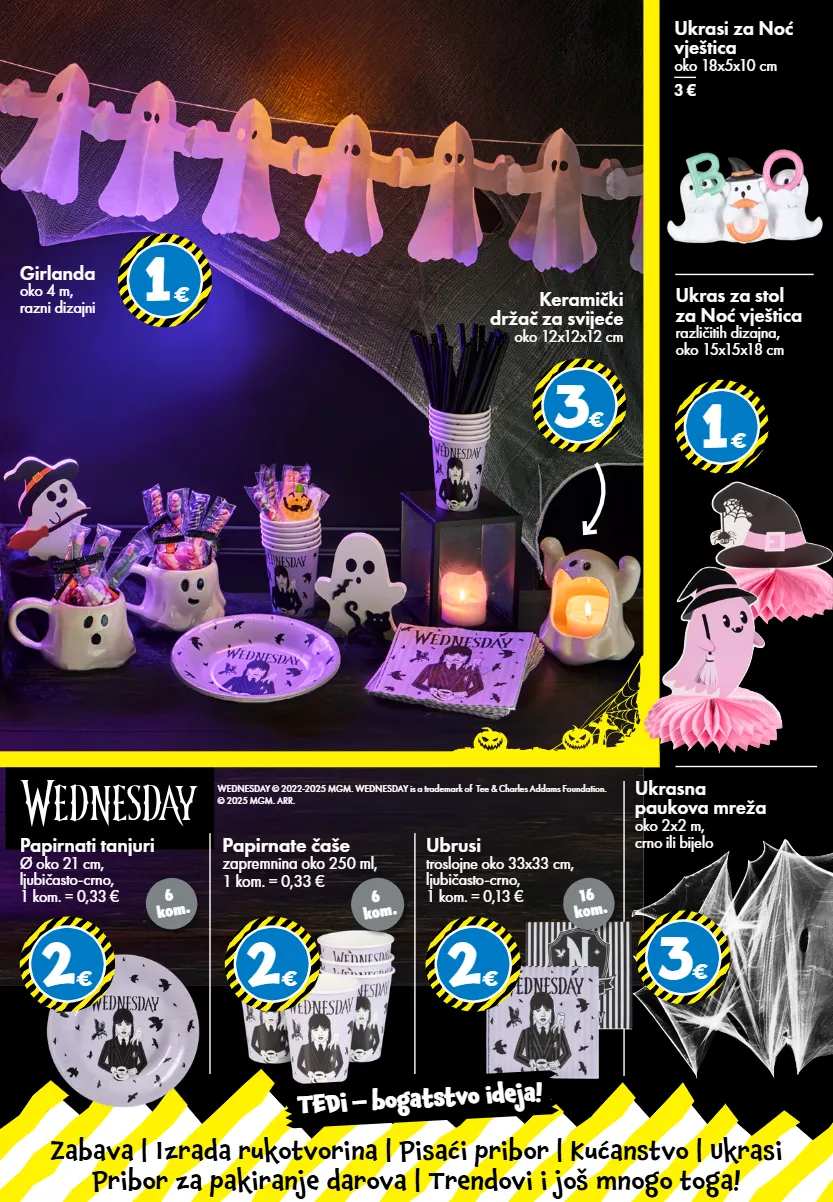 Zabava | Izrada rukotvorina | Pisaći pribor | Kućanstvo | Ukrasi Pribor za pakiranje darova | Trendovi i još mnogo toga! Samo do isteka zaliha. Proizvod nije dostupan u svim poslovnicama. TEDi – bogatstvo ideja! Plišana igračka različiti dizajni, oko 18 cm Papirnate čaše zapremnina oko 250 ml, 1 kom. = 0,33 € 6 kom. 2 € WEDNESDAY © 2022-2025 MGM. WEDNESDAY is a trademark of Tee & Charles Addams Foundation. © 2025 MGM. ARR. Mirisna svijeća razne boje i mirisi, 2 fitilja, 10x10 cm, gori oko 35 sati, 5 € 8x9 cm, gori oko 30 sati 4 € Vrijedi od 17.10.2025. do 25.10.2025. Kapibara stranica 4- 7 Ne pada samo lišće, padaju i cijene. Noć vještica stranica 12- 16 Jesen stranica 24-25 EKSTREMNA 3 €