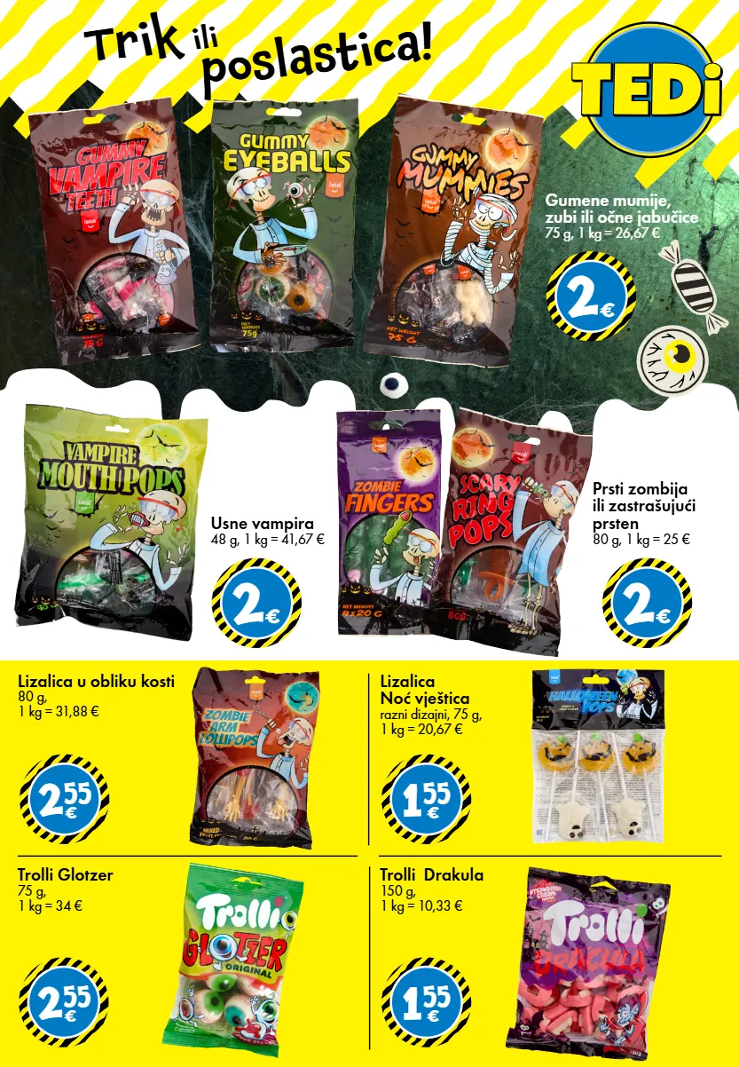 Prsti zombija ili zastrašujući prsten 80 g, 1 kg = 25 € Gumene mumije, zubi ili očne jabučice 75 g, 1 kg = 26,67 € Usne vampira 48 g, 1 kg = 41,67 € 2 € 2 € Lizalica Noć vještica razni dizajni, 75 g, 1 kg = 20,67 € Trolli Drakula 150 g, 1 kg = 10,33 € Trolli Glotzer 75 g, 1 kg = 34 € Lizalica u obliku kosti 80 g, 1 kg = 31,88 € 2 55 € 2 55 € 1 55 € 1 55 € Trik ili poslastica! 2 €