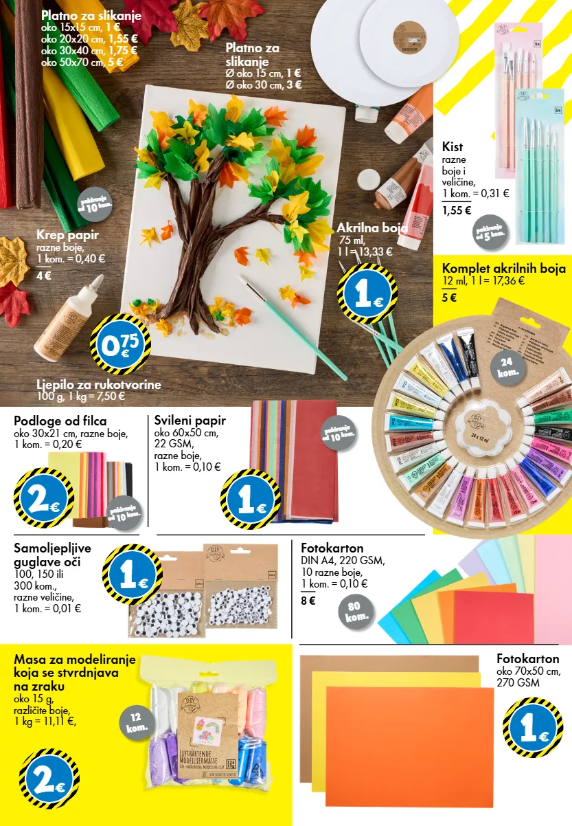 fotokarton din a4, 220 gsm, 10 razne boje, 1 kom. = 0,10 € 8 € pakiranje od 10 kom. 2 € platno za slikanje oko 15x15 cm, 1 € oko 20x20 cm, 1,55 € oko 30x40 cm, 1,75 € oko 50x70 cm, 5 € platno za slikanje ø oko 15 cm, 1 € ø oko 30 cm, 3 € krep papir razne boje, 1 kom. = 0,40 € 4 € masa za modeliranje koja se stvrdnjava na zraku oko 15 g, različite boje, 1 kg = 11,11 €, fotokarton oko 70x50 cm, 270 gsm 80 kom. komplet akrilnih boja 12 ml, 1 l = 17,36 € 5 € samoljepljive guglave oči 100, 150 ili 300 kom., razne veličine, 1 kom. = 0,01 € ljepilo za rukotvorine 100 g, 1 kg = 7,50 € svileni papir oko 60x50 cm, 22 gsm, razne boje, 1 kom. = 0,10 € akrilna boja 75 ml, 1 l = 13,33 € 1 € 1 € 2 € 12 kom. kist razne boje i veličine, 1 kom. = 0,31 € 1,55 € podloge od filca oko 30x21 cm, razne boje, 1 kom. = 0,20 € 1 € € 0 7 5 1 € 24 kom. pakiranje od 5 kom. pakiranje od 10 kom. pakiranje od 10 kom.