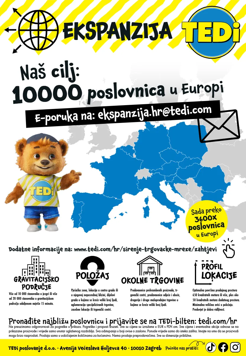 Pronađite najbližu poslovnicu i prijavite se na TEDi-bilten: tedi.com/hr Ne preuzimamo odgovornosti za pogreške u prikazu. Pogreške i propusti izuzeti. Sve su cijene su izražene u EUR s PDV-om. Sve cijene i eventualne akcije odnose se na prikazane proizvode i vrijede samo unutar oglašenog razdoblja. Sva odstupanja u boji ovise o zaslonu. Ponude vrijede samo do isteka zaliha. Imajte na umu da se proizvodi mogu brzo rasprodati. Prodaja samo u uobičajenim količinama za kućanstvo. Nema prodaje preprodavačima. Sve su dimenzije približne. 3600x poslovnica u Europi GRAVITACIJSKO PODRUČJE POLOŽAJ PROFIL LOKACIJE OKOLNE TRGOVINE Više od 10 000 stanovnika u jezgri ili više od 20 000 stanovnika u gravitacijskom području udaljenom najviše 15 minuta. Pješačka zona, lokacija u centru grada ili u njegovoj neposrednoj blizini, dijelovi grada u kojima se kreće veliki broj ljudi, aglomeracija specijaliziranih trgovina, zasebne lokacije ili trgovački centri. Prodavaonice prehrambenih proizvoda, tr- govački centri, prodavaonice odjeće i obuće, drogerije i druge maloprodajne trgovine u kojima se kreće veliki broj ljudi. Optimalna površina prodajnog prostora 650 kvadratnih metara ili više, plus oko 50 kvadratnih metara dodatnog prostora. Minimalna veličina ovisi o položaju. Preduvjet je dobra vidljivost. Naš cil j : 10000 poslovnica u Europi Sada preko Dodatne informacije na: www.tedi.com/hr/sirenje-trgovacke-mreze/zahtjevi E-poruka na: ekspanzija.hr@tedi.com Počnite nas pratiti: TEDi poslovanje d.o.o. · Avenija Većeslava Holjevca 40 · 10010 Zagreb EKSPANZIJA