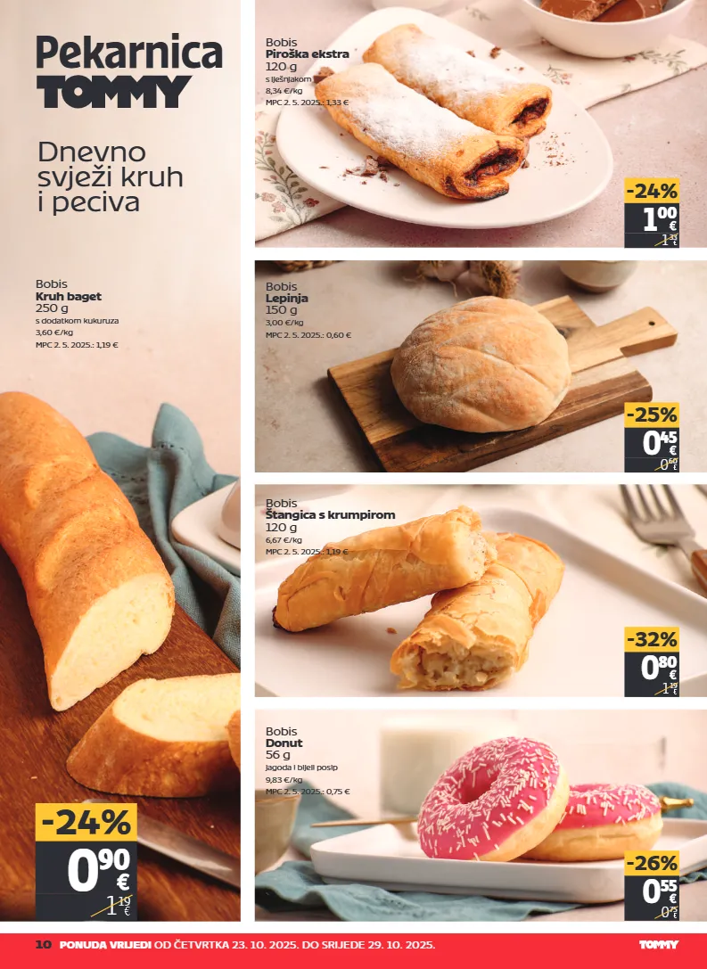 10 ponuda vrijedi od četvrtka 23. 10. 2025. do srijede 29. 10. 2025. pekarnica dnevno svježi kruh i peciva bobis donut 56 g jagoda i bijeli posip 9,83 €/kg mpc 2. 5. 2025.: 0,75 € 0 55 0 75 -26% bobis štangica s krumpirom 120 g 6,67 €/kg mpc 2. 5. 2025.: 1,19 € 0 80 1 19 -32% bobis lepinja 150 g 3,00 €/kg mpc 2. 5. 2025.: 0,60 € bobis piroška ekstra 120 g s lješnjakom 8,34 €/kg mpc 2. 5. 2025.: 1,33 € 0 45 0 60 -25% 1 00 1 33 -24% bobis kruh baget 250 g s dodatkom kukuruza 3,60 €/kg mpc 2. 5. 2025.: 1,19 € 0 90 1 19 -24%
