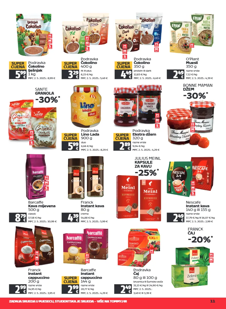 zadnja srijeda u mjesecu, studentska je srijeda – više na tommy.hr 11 podravka čokolino lješnjak 1 kg mpc 2. 5. 2025.: 8,99 € 5 99 super cijena podravka čokolino 400 g fit ili plus 8,23 €/kg mpc 2. 5. 2025.: 5,49 € 3 29 super cijena sante granola -30% * podravka ekstra džem 320 g razne vrste 9,04 €/kg mpc 2. 5. 2025.: 4,29 € 2 89 super cijena barcaffe kava mljevena 500 g classic 17,58 €/kg mpc 2. 5. 2025.: 10,99 € 8 79 nescafe instant kava 140 g ili 155 g razne vrste 17,79 €/kg ili 16,07 €/kg mpc 2. 5. 2025.: 2,99 € 2 49 franck instant kava 80 g crema 54,88 €/kg mpc 2. 5. 2025.: 5,99 € 4 39 franck instant cappuccino 200 g razne vrste 14,95 €/kg mpc 2. 5. 2025.: 3,95 € 2 99 julius meinl kapsule za kavu -25% * franck čaj -20% * o’plant muesli 350 g razne vrste 7,12 €/kg mpc 2. 5. 2025.: 4,39 € 2 49 bonne maman džem -30% * barcaffe instant cappuccino 144 g razne vrste 20,77 €/kg mpc 2. 5. 2025.: 4,29 € 2 99 super cijena podravka čaj 80 g ili 100 g brusnica ili šumsko voće 31,13 €/kg ili 24,90 €/kg mpc 2. 5. 2025.: 3,49 € ili 3,39 € 2 49 podravka čokolino 350 g protein ili dark 12,83 €/kg mpc 2. 5. 2025.: 6,49 € 4 49 super cijena podravka lino lada 900 g duo 6,66 €/kg mpc 2. 5. 2025.: 8,29 € 5 99 super cijena