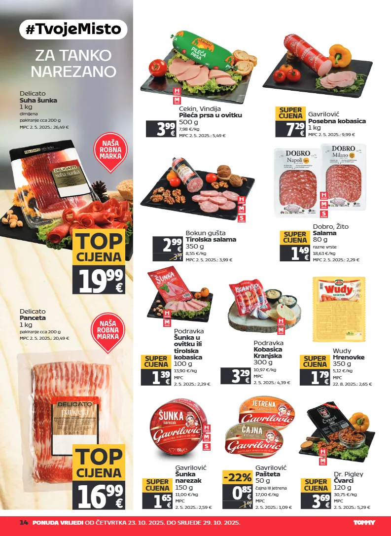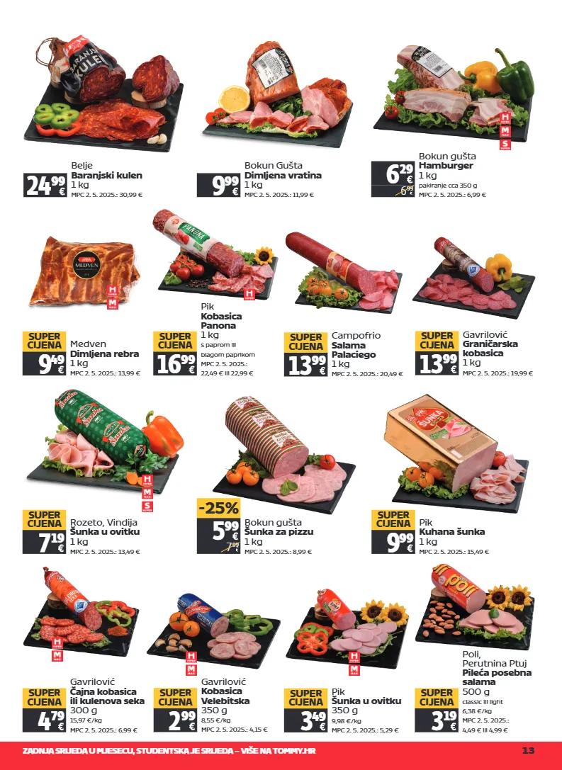 zadnja srijeda u mjesecu, studentska je srijeda – više na tommy.hr 13 belje baranjski kulen 1 kg mpc 2. 5. 2025.: 30,99 € 24 99 bokun gušta dimljena vratina 1 kg mpc 2. 5. 2025.: 11,99 € 9 99 gavrilović graničarska kobasica 1 kg mpc 2. 5. 2025.: 19,99 € 13 99 super cijena campofrio salama palaciego 1 kg mpc 2. 5. 2025.: 20,49 € 13 99 super cijena pik kuhana šunka 1 kg mpc 2. 5. 2025.: 15,49 € 9 99 super cijena rozeto, vindija šunka u ovitku 1 kg mpc 2. 5. 2025.: 13,49 € 7 19 super cijena 5 99 7 99 -25% bokun gušta šunka za pizzu 1 kg mpc 2. 5. 2025.: 8,99 € 6 29 6 99 bokun gušta hamburger 1 kg pakiranje cca 350 g mpc 2. 5. 2025.: 6,99 € gavrilović čajna kobasica ili kulenova seka 300 g 15,97 €/kg mpc 2. 5. 2025.: 6,99 € 4 79 super cijena gavrilović kobasica velebitska 350 g 8,55 €/kg mpc 2. 5. 2025.: 4,15 € 2 99 super cijena 9 49 super cijena medven dimljena rebra 1 kg mpc 2. 5. 2025.: 13,99 € pik šunka u ovitku 350 g 9,98 €/kg mpc 2. 5. 2025.: 5,29 € 3 49 super cijena poli, perutnina ptuj pileća posebna salama 500 g classic ili light 6,38 €/kg mpc 2. 5. 2025.: 4,49 € ili 4,99 € 3 19 super cijena pik kobasica panona 1 kg s paprom ili blagom paprikom mpc 2. 5. 2025.: 22,49 € ili 22,99 € 16 99 super cijena