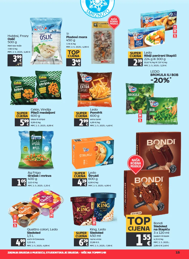 zadnja srijeda u mjesecu, studentska je srijeda – više na tommy.hr 15 s m r z n u t o 3 99 hubbsi, frozy oslić 500 g fileti bez kože 7,98 €/kg mpc 2. 5. 2025.: 4,80 € 3 99 4 80 t! plodovi mora 450 g 7,76 €/kg mpc 2. 5. 2025.: 4,99 € 3 49 top cijena ledo riblji panirani štapići 224 g ili 300 g 10,67 €/kg ili 7,97 €/kg mpc 2. 5. 2025.: 3,29 € 2 39 super cijena ledo pomfrit 600 g extra tanki 4,99 €/kg mpc 2. 5. 2025.: 4,49 € 2 99 super cijena ledo brokula ili bob -20% * ag frigo grašak i mrkva 400 g 2,63 €/kg mpc 2. 5. 2025.: 1,35 € 1 05 ledo štrukli 600 g 6,99 €/kg mpc 2. 5. 2025.: 4,99 € 4 19 super cijena cekin, vindija pileći medaljoni 600 g bitesi ili stripsi 9,99 €/kg mpc 2. 5. 2025.: 8,99 € 5 99 super cijena king, ledo sladoled 450 ml razne vrste 13,98 €/l mpc 2. 5. 2025.: 7,99 € 6 29 super cijena bondi sladoled na štapiću 3 x 120 ml badem ili klasik 4,31 €/kg mpc 2. 5. 2025.: 2,99 € ili 2,49 € 1 55 top cijena quattro colori, ledo sladoled 1,5 l voćni ili čokolada 3,33 €/l mpc 2. 5. 2025.: 6,99 € 4 99