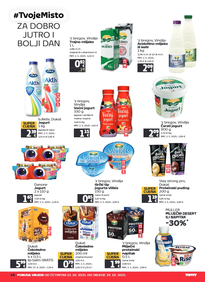 18 ponuda vrijedi od četvrtka 23. 10. 2025. do srijede 29. 10. 2025. za dobro jutro i bolji dan b.aktiv, dukat jogurt 1 kg jagoda ili natur mpc 2. 5. 2025.: 3,15 € ili 2,85 € 2 39 super cijena ‘z bregov, vindija mliječni proteinski napitak 0,5 l razne vrste 3,98 €/l mpc 2. 5. 2025.: 2,99 € 1 99 super cijena ‘z bregov, vindija acidofilno mlijeko ili kefir 1 kg 3,2% m.m. ili 3,5 % m.m. mpc 2. 5. 2025.: 2,79 € ili 2,65 € 2 09 ‘z bregov, vindija grčki tip jogurta vilikis 150 g natur ili punč 5,67 €/kg mpc 2. 5. 2025.: 1,09 € 0 85 0 92 1 02 ‘z bregov, vindija trajno mlijeko 1 l 2,8% m.m. original ili s vitaminom d mpc 2. 5. 2025.: 1,02 € 5 99 dukat čokoladno mlijeko 4 x 0,5 l lip balm gratis 3,00 €/l mpc 27. 9. 2025.: 7,29 € dukat čokoladno mlijeko 200 ml original ili junior 3,95 €/l mpc 2. 5. 2025.: 1,09 € il 1,25 € i 0 79 super cijena ‘z bregov, vindija čvrsti jogurt 900 g 2,33 €/kg mpc 2. 5. 2025.: 2,69 € 2 09 1 15 ‘z bregov, vindija voćni jogurt 330 g jagoda i vanilija ili malina i kupina 3,49 €/kg mpc 2. 5. 2025.: 1,45 € danone jogurt 2 x 110 g jagoda 7,50 €/kg mpc 2. 5. 2025.: 2,29 € 1 65 stay strong pro, dukat proteinski puding 200 g razne vrste 5,95 €/kg mpc 2. 5. 2025.: 1,69 € 1 19 super cijena muller mliječni desert ili napitak -30% *