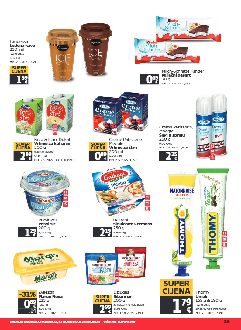 zadnja srijeda u mjesecu, studentska je srijeda – više na tommy.hr 19 landessa ledena kava 230 ml razne vrste 6,92 €/l mpc 2. 5. 2025.: 2,49 € 1 59 super cijena milch-schnitte, kinder mliječni desert 28 g mpc 2. 5. 2025.: 0,79 € 0 65 creme patisserie, maggle šlag u spreju 250 g 9,00 €/kg mpc 2. 5. 2025.: 2,99 € 2 25 president posni sir 200 g 6,45 €/kg mpc 2. 5. 2025.: 1,55 € 1 29 galbani sir ricotta cremosa 250 g 8,76 €/kg mpc 2. 5. 2025.: 2,49 € 2 19 creme patisserie, meggle vrhnje za šlag 200 ml 4,45 €/kg mpc 2. 5. 2025.: 1,35 € 0 89 super cijena 0 89 1 29 -31% zvijezda margo nova 225 g natural 3,96 €/kg mpc 2. 5. 2025.: 1,19 € džiugas ribani sir 200 g za tjesteninu ili za pizzu 14,95 €/kg mpc 12. 8. 2025.: 4,49 € 2 99 super cijena thomy umak 165 g ili 180 g razne vrste 10,85 €/kg ili 9,95 €/kg mpc 2. 5. 2025.: 2,99 € 1 79 super cijena 2 69 super cijena brzo & fino, dukat vrhnje za kuhanje 500 g klasik ili lagano 5,58 €/kg mpc 2. 5. 2025.: 3,39 € ili 3,99 €
