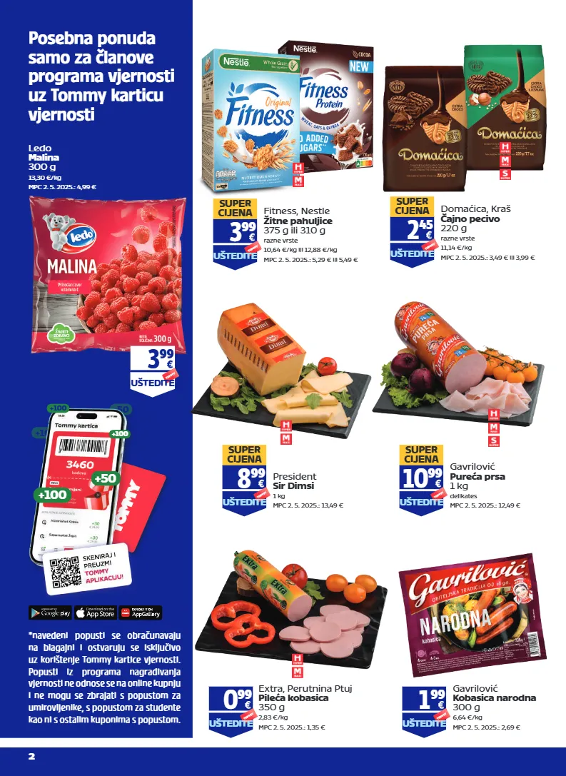 posebna ponuda samo za članove programa vjernosti uz tommy karticu vjernosti *navedeni popusti se obračunavaju na blagajni i ostvaruju se isključivo uz korištenje tommy kartice vjernosti. popusti iz programa nagrađivanja vjernosti ne odnose se na online kupnju i ne mogu se zbrajati s popustom za umirovljenike, s popustom za studente kao ni s ostalim kuponima s popustom. +50 +100 +100 +50 +100 +100 2 fitness, nestle žitne pahuljice 375 g ili 310 g razne vrste 10,64 €/kg ili 12,88 €/kg mpc 2. 5. 2025.: 5,29 € ili 5,49 € uštedite super cijena 3 99 domaćica, kraš čajno pecivo 220 g razne vrste 11,14 €/kg mpc 2. 5. 2025.: 3,49 € ili 3,99 € uštedite super cijena 2 45 president sir dimsi 1 kg mpc 2. 5. 2025.: 13,49 € uštedite super cijena 8 99 ledo malina 300 g 13,30 €/kg mpc 2. 5. 2025.: 4,99 € uštedite 3 99 gavrilović kobasica narodna 300 g 6,64 €/kg mpc 2. 5. 2025.: 2,69 € uštedite 1 99 extra, perutnina ptuj pileća kobasica 350 g 2,83 €/kg mpc 2. 5. 2025.: 1,35 € uštedite 0 99 gavrilović pureća prsa 1 kg delikates mpc 2. 5. 2025.: 12,49 € uštedite super cijena 10 99