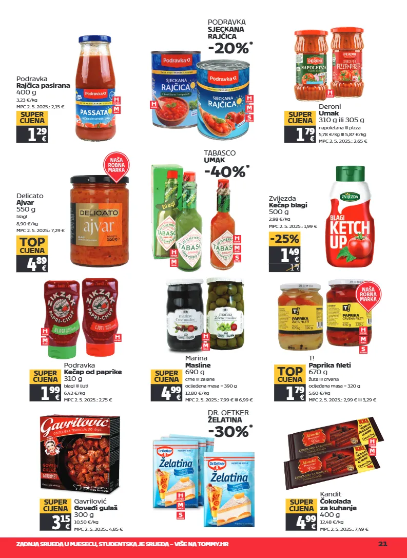 zadnja srijeda u mjesecu, studentska je srijeda – više na tommy.hr 21 delicato ajvar 550 g blagi 8,90 €/kg mpc 2. 5. 2025.: 7,29 € 4 89 top cijena 1 49 1 99 -25% zvijezda kečap blagi 500 g 2,98 €/kg mpc 2. 5. 2025.: 1,99 € t! paprika fileti 670 g žuta ili crvena ocijeđena masa = 320 g 5,60 €/kg mpc 2. 5. 2025.: 2,99 € ili 3,29 € 1 79 top cijena gavrilović goveđi gulaš 300 g 10,50 €/kg mpc 2. 5. 2025.: 4,85 € 3 15 super cijena dr. oetker želatina -30% * podravka rajčica pasirana 400 g 3,23 €/kg mpc 2. 5. 2025.: 2,15 € 1 29 super cijena podravka sjeckana rajčica -20% * deroni umak 310 g ili 305 g napoletana ili pizza 5,78 €/kg ili 5,87 €/kg mpc 2. 5. 2025.: 2,65 € 1 79 super cijena tabasco umak -40% * marina masline 690 g crne ili zelene ocijeđena masa = 390 g 12,80 €/kg mpc 2. 5. 2025.: 7,99 € ili 6,99 € 4 99 super cijena kandit čokolada za kuhanje 400 g 12,48 €/kg mpc 2. 5. 2025.: 7,49 € 4 99 super cijena podravka kečap od paprike 310 g blagi ili ljuti 6,42 €/kg mpc 2. 5. 2025.: 2,75 € 1 99 super cijena