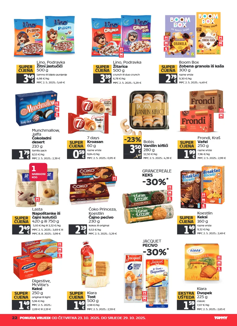 22 ponuda vrijedi od četvrtka 23. 10. 2025. do srijede 29. 10. 2025. 3 49 super cijena lino, podravka žitni jastučići 500 g tamno ili bijelo punjenje 6,98 €/kg mpc 2. 5. 2025.: 5,49 € munchmallow, jaffa čokoladni desert 210 g family pack 8,53 €/kg mpc 2. 5. 2025.: 2,39 € 1 79 bobis vanilin kiflići 280 g 12,50 €/kg mpc 2. 5. 2025.: 4,39 € 3 50 4 60 -23% 7 days kroasan 60 g razne vrste 9,84 €/kg mpc 2. 5. 2025.: 0,95 € 0 59 super cijena grancereale keks -30% * koestlin keksi 160 g razne vrste 9,32 €/kg mpc 2. 5. 2025.: 2,49 € 1 49 super cijena digestive, mcvitie’s keksi 250 g original ili light 5,96 €/kg mpc 2. 5. 2025.: 2,09 € ili 2,19 € 1 49 super cijena klara tost 500 g 2,98 €/kg mpc 2. 5. 2025.: 2,59 € 1 49 super cijena klara dvopek 225 g classic 7,07 €/kg mpc 2. 5. 2025.: 2,65 € 1 59 ekstra ušteda 3 39 super cijena lino, podravka žitarice 500 g crunch ili duo crunch 6,78 €/kg mpc 2. 5. 2025.: 5,29 € frondi, kraš vafel 250 g razne vrste 7,96 €/kg mpc 2. 5. 2025.: 2,99 € 1 99 super cijena 2 19 čoko princeza, koestlin čajno pecivo 230 g kokos ili original 9,53 €/kg mpc 2. 5. 2025.: 3,29 € lasta napolitanke ili čajni kolutići 420 g ili 750 g 5,93 €/kg ili 3,32 €/kg mpc 2. 5. 2025.: 3,69 € ili mpc 8. 8. 2025.: 3,99 € 2 49 super cijena jacquet pecivo -30% * boom box zobena granola ili kaša 300 g razne vrste 9,30 €/kg mpc 2. 5. 2025.: 4,49 € 2 79 super cijena