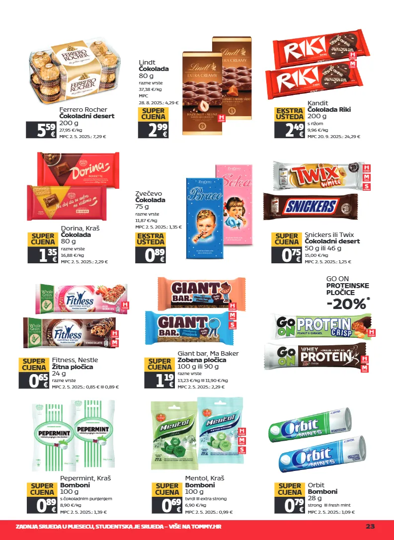 zadnja srijeda u mjesecu, studentska je srijeda – više na tommy.hr 23 ferrero rocher čokoladni desert 200 g 27,95 €/kg mpc 2. 5. 2025.: 7,29 € 5 59 snickers ili twix čokoladni desert 50 g ili 46 g 15,00 €/kg mpc 2. 5. 2025.: 1,25 € 0 75 super cijena mentol, kraš bomboni 100 g tvrdi ili extra strong 6,90 €/kg mpc 2. 5. 2025.: 0,99 € 0 69 super cijena orbit bomboni 28 g strong ili fresh mint mpc 2. 5. 2025.: 1,09 € 0 79 super cijena pepermint, kraš bomboni 100 g s čokoladnim punjenjem 8,90 €/kg mpc 2. 5. 2025.: 1,39 € 0 89 super cijena 2 49 ekstra ušteda kandit čokolada riki 200 g s rižom 9,96 €/kg mpc 20. 9. 2025.: 24,29 € zvečevo čokolada 75 g razne vrste 11,87 €/kg mpc 2. 5. 2025.: 1,35 € 0 89 ekstra ušteda lindt čokolada 80 g razne vrste 37,38 €/kg mpc 28. 8. 2025.: 4,29 € 2 99 super cijena fitness, nestle žitna pločica 24 g razne vrste mpc 2. 5. 2025.: 0,85 € ili 0,89 € 0 65 super cijena giant bar, ma baker zobena pločica 100 g ili 90 g razne vrste 13,23 €/kg ili 11,90 €/kg mpc 2. 5. 2025.: 2,29 € 1 19 super cijena dorina, kraš čokolada 80 g razne vrste 16,88 €/kg mpc 2. 5. 2025.: 2,29 € 1 35 super cijena go on proteinske pločice -20% *