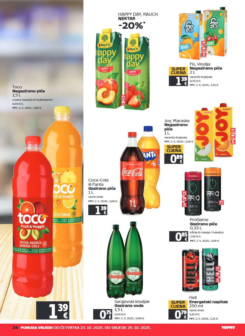 26 ponuda vrijedi od četvrtka 23. 10. 2025. do srijede 29. 10. 2025. fis, vindija negazirano piće 2 l naranča ili jabuka 0,70 €/l mpc 2. 5. 2025.: 2,15 € 1 39 super cijena toco negazirano piće 1,5 l crvena naranča ili multivitamin 0,93 €/l mpc 2. 5. 2025.: 1,89 € joy, maraska negazirano piće 1 l naranča ili jabuka mpc 2. 5. 2025.: 1,49 € 0 89 super cijena 1 39 hell energetski napitak 250 ml razne vrste 3,16 €/l mpc 2. 5. 2025.: 1,25 € 0 79 super cijena coca-cola ili fanta gazirano piće 1 l razne vrste mpc 2. 5. 2025.: 1,69 € sarajevski kiseljak gazirana voda 1,5 l 0,50 €/l mpc 2. 5. 2025.: 0,99 € 0 75 happy day, rauch nektar -20% * progame gazirano piće 0,33 l višnja ili mango i marelica 2,58 €/l mpc 2. 5. 2025.: 1,09 € 0 85 1 39