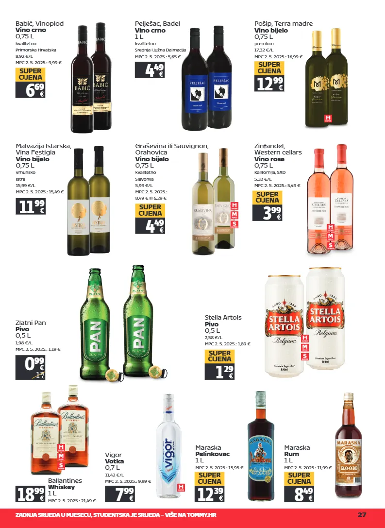 zadnja srijeda u mjesecu, studentska je srijeda – više na tommy.hr 27 0 99 1 19 zlatni pan pivo 0,5 l 1,98 €/l mpc 2. 5. 2025.: 1,19 € maraska pelinkovac 1 l mpc 2. 5. 2025.: 15,95 € 12 39 super cijena maraska rum 1 l mpc 2. 5. 2025.: 11,99 € 8 49 super cijena babić, vinoplod vino crno 0,75 l kvalitetno primorska hrvatska 8,92 €/l mpc 2. 5. 2025.: 9,99 € 6 69 super cijena malvazija istarska, vina festigia vino bijelo 0,75 l vrhunsko istra 15,99 €/l mpc 2. 5. 2025.: 15,49 € 11 99 pelješac, badel vino crno 1 l kvalitetno srednja i južna dalmacija mpc 2. 5. 2025.: 5,65 € 4 49 graševina ili sauvignon, orahovica vino bijelo 0,75 l kvalitetno slavonija 5,99 €/l mpc 2. 5. 2025.: 8,49 € ili 6,29 € 4 49 super cijena stella artois pivo 0,5 l 2,58 €/l mpc 2. 5. 2025.: 1,89 € 1 29 super cijena ballantines whiskey 1 l mpc 2. 5. 2025.: 21,49 € 18 99 pošip, terra madre vino bijelo 0,75 l premium 17,32 €/l mpc 2. 5. 2025.: 16,99 € 12 99 super cijena vigor votka 0,7 l 11,42 €/l mpc 2. 5. 2025.: 9,99 € 7 99 zinfandel, western cellars vino rose 0,75 l kalifornija, sad 5,32 €/l mpc 2. 5. 2025.: 5,49 € 3 99 super cijena