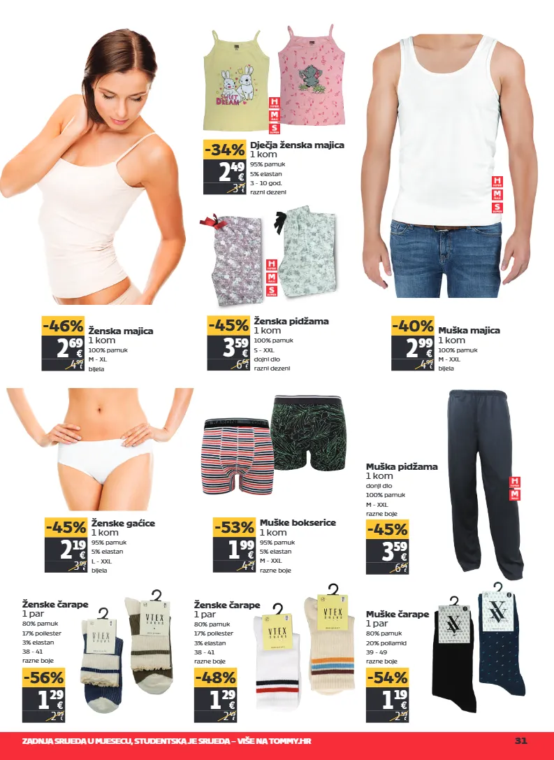 zadnja srijeda u mjesecu, studentska je srijeda – više na tommy.hr 31 dječja ženska majica 1 kom 95% pamuk 5% elastan 3 - 10 god. razni dezeni ženska majica 1 kom 100% pamuk m - xl bijela muška majica 1 kom 100% pamuk m - xxl bijela ženska pidžama 1 kom 100% pamuk s - xxl dojni dio razni dezeni muška pidžama 1 kom donji dio 100% pamuk m - xxl razne boje ženske gaćice 1 kom 95% pamuk 5% elastan l - xxl bijela muške bokserice 1 kom 95% pamuk 5% elastan m - xxl razne boje ženske čarape 1 par 80% pamuk 17% poliester 3% elastan 38 - 41 razne boje ženske čarape 1 par 80% pamuk 17% poliester 3% elastan 38 - 41 razne boje muške čarape 1 par 80% pamuk 20% poliamid 39 - 49 razne boje 2 49 3 79 -34% 2 69 4 99 -46% 2 99 4 99 -40% 3 59 6 64 -45% 3 59 6 64 -45% 2 19 3 99 -45% 1 99 4 29 -53% 1 29 2 99 -56% 1 29 2 49 -48% 1 19 2 59 -54%