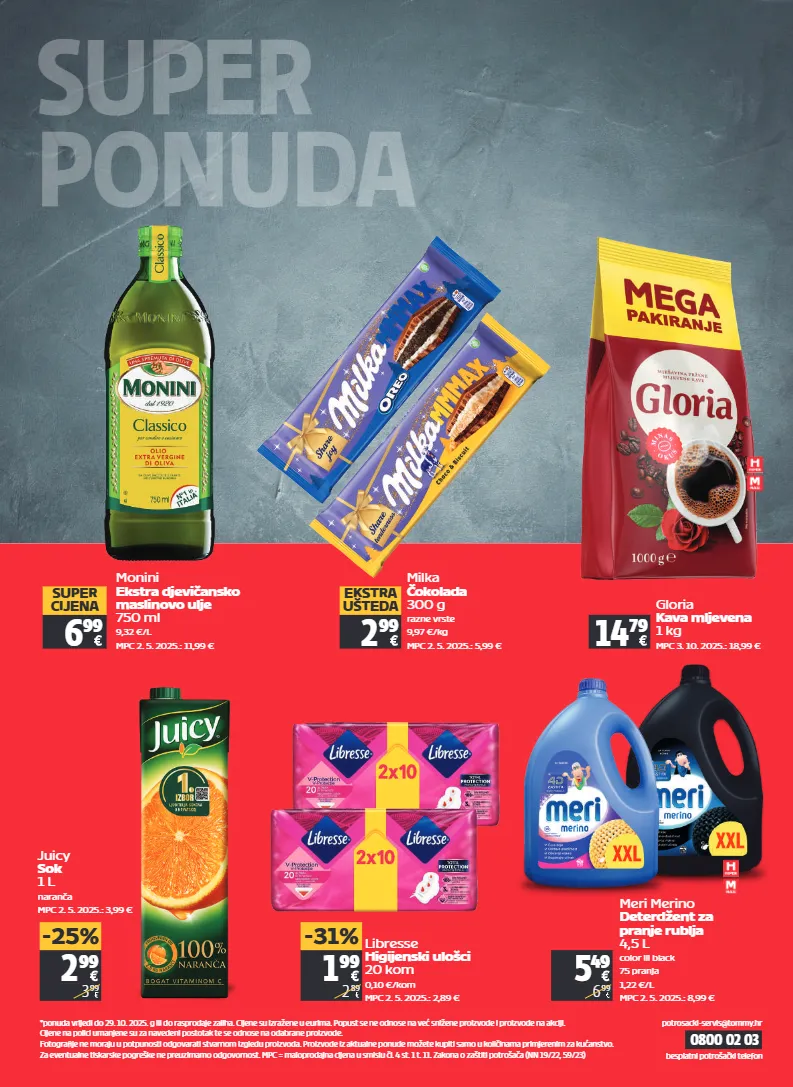 32 ponuda vrijedi od četvrtka 23. 10. 2025. do srijede 29. 10. 2025. 0800 02 03 *ponuda vrijedi do 29. 10. 2025. g ili do rasprodaje zaliha. cijene su izražene u eurima. popust se ne odnose na već snižene proizvode i proizvode na akciji. cijene na polici umanjene su za navedeni postotak te se odnose na odabrane proizvode. fotografije ne moraju u potpunosti odgovarati stvarnom izgledu proizvoda. proizvode iz aktualne ponude možete kupiti samo u količinama primjerenim za kućanstvo. za eventualne tiskarske pogreške ne preuzimamo odgovornost. mpc = maloprodajna cijena u smislu čl. 4 st. 1 t. 11. zakona o zaštiti potrošača (nn 19/22, 59/23) besplatni potrošački telefon potrosacki-servis@tommy.hr super ponuda monini ekstra djevičansko maslinovo ulje 750 ml 9,32 €/l mpc 2. 5. 2025.: 11,99 € 6 99 super cijena milka čokolada 300 g razne vrste 9,97 €/kg mpc 2. 5. 2025.: 5,99 € 2 99 ekstra ušteda gloria kava mljevena 1 kg mpc 3. 10. 2025.: 18,99 € 14 79 juicy sok 1 l naranča mpc 2. 5. 2025.: 3,99 € 2 99 3 99 -25% 5 49 6 99 meri merino deterdžent za pranje rublja 4,5 l color ili black 75 pranja 1,22 €/l mpc 2. 5. 2025.: 8,99 € 1 99 2 89 -31% libresse higijenski ulošci 20 kom 0,10 €/kom mpc 2. 5. 2025.: 2,89 €