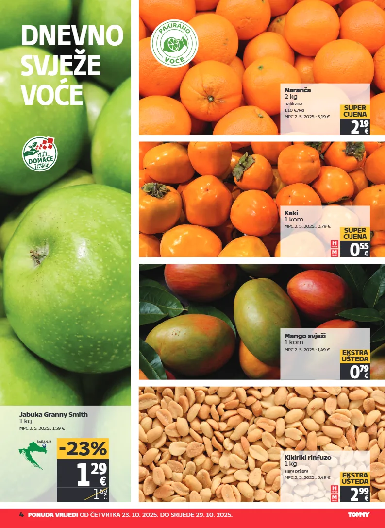 4 ponuda vrijedi od četvrtka 23. 10. 2025. do srijede 29. 10. 2025. dnevno svježe voće jabuka granny smith 1 kg mpc 2. 5. 2025.: 1,59 € 1 29 1 69 -23% kaki 1 kom mpc 2. 5. 2025.: 0,79 € 0 55 super cijena mango svježi 1 kom mpc 2. 5. 2025.: 1,49 € 0 79 ekstra ušteda naranča 2 kg pakirana 1,10 €/kg mpc 2. 5. 2025.: 3,19 € 2 19 super cijena kikiriki rinfuzo 1 kg slani prženi mpc 2. 5. 2025.: 5,49 € 2 99 ekstra ušteda v o e