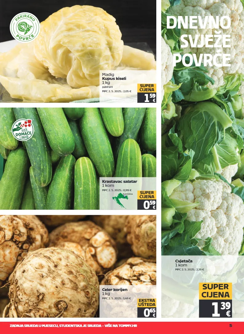 zadnja srijeda u mjesecu, studentska je srijeda – više na tommy.hr 5 dnevno svježe povrće cvjetača 1 kom mpc 2. 5. 2025.: 2,19 € 1 39 super cijena celer korijen 1 kg mpc 2. 5. 2025.: 1,49 € 0 65 ekstra ušteda madig kupus kiseli 1 kg pakirani mpc 2. 5. 2025.: 2,05 € 1 59 super cijena krastavac salatar 1 kom mpc 2. 5. 2025.: 0,99 € 0 59 super cijena p o v r e