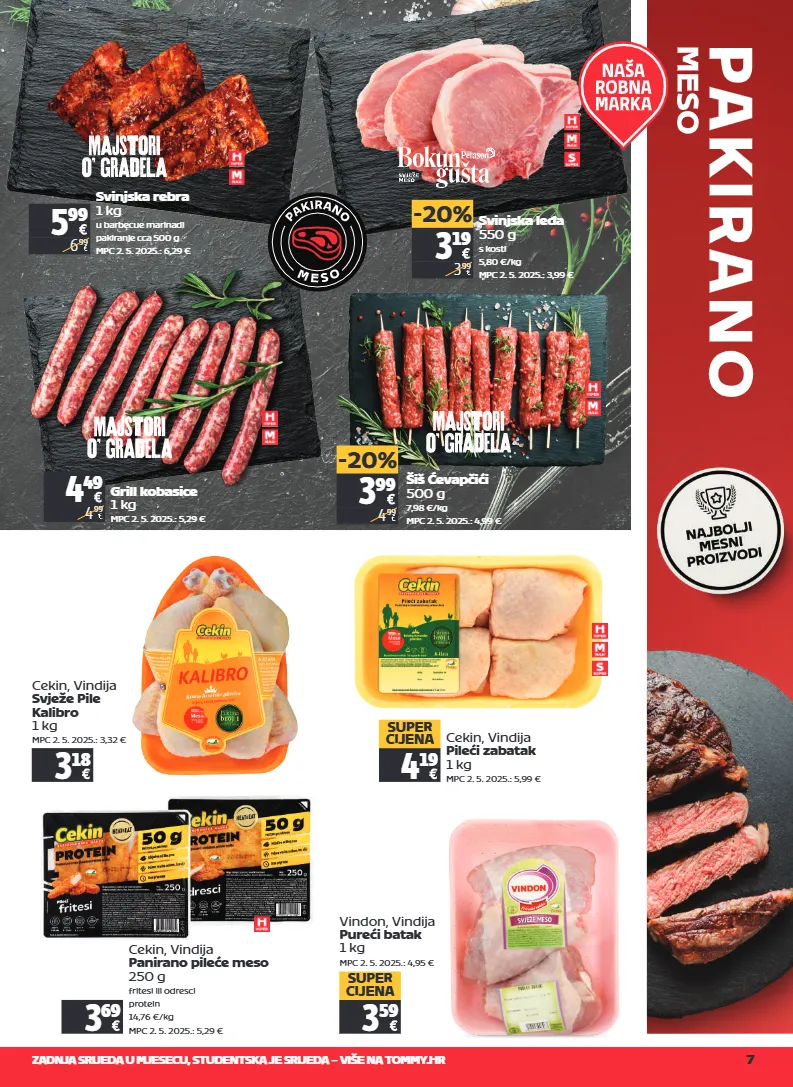 zadnja srijeda u mjesecu, studentska je srijeda – više na tommy.hr 7 svinjska rebra 1 kg u barbecue marinadi pakiranje cca 500 g mpc 2. 5. 2025.: 6,29 € svinjska leđa 550 g s kosti 5,80 €/kg mpc 2. 5. 2025.: 3,99 € grill kobasice 1 kg mpc 2. 5. 2025.: 5,29 € šiš ćevapčići 500 g 7,98 €/kg mpc 2. 5. 2025.: 4,99 € 5 99 6 99 3 19 3 99 -20% 4 49 4 99 3 99 4 99 -20% cekin, vindija svježe pile kalibro 1 kg mpc 2. 5. 2025.: 3,32 € 3 18 cekin, vindija pileći zabatak 1 kg mpc 2. 5. 2025.: 5,99 € 4 19 super cijena cekin, vindija panirano pileće meso 250 g fritesi ili odresci protein 14,76 €/kg mpc 2. 5. 2025.: 5,29 € 3 69 vindon, vindija pureći batak 1 kg mpc 2. 5. 2025.: 4,95 € 3 59 super cijena
