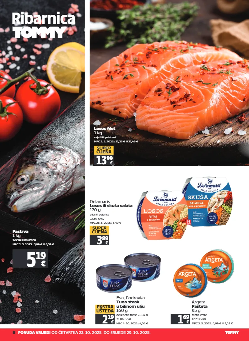 8 ponuda vrijedi od četvrtka 23. 10. 2025. do srijede 29. 10. 2025. 1 69 ribarnica delamaris losos ili skuša salata 170 g vital ili balance 22,89 €/kg mpc 28. 5. 2025.: 5,49 € 3 89 super cijena eva, podravka tuna steak u biljnom ulju 160 g ocijeđena masa = 104 g 21,06 €/kg mpc 4. 10. 2025.: 4,05 € 2 19 ekstra ušteda argeta pašteta 95 g razne vrste 17,79 €/kg mpc 2. 5. 2025.: 1,99 € ili 2,29 € 13 99 super cijena 5 19 pastrva 1 kg svježa ili pakirana mpc 2. 5. 2025.: 5,99 € ili 6,39 € losos filet 1 kg svježi ili pakirani mpc 2. 5. 2025.: 21,25 € ili 21,49 €
