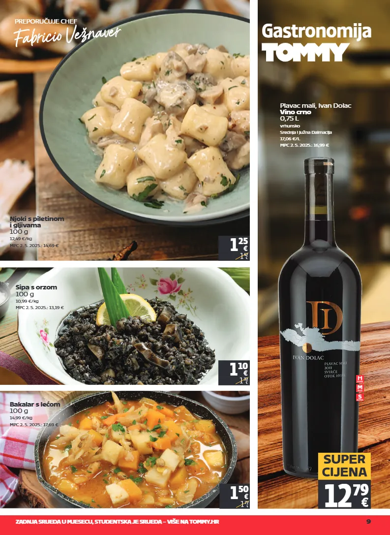 zadnja srijeda u mjesecu, studentska je srijeda – više na tommy.hr 9 gastronomija 12 79 super cijena 1 50 1 77 sipa s orzom 100 g 10,99 €/kg mpc 2. 5. 2025.: 13,19 € 1 10 1 32 preporučuje chef bakalar s lećom 100 g 14.99 €/kg mpc 2. 5. 2025.: 17,69 € 1 25 1 47 njoki s piletinom i gljivama 100 g 12,49 €/kg mpc 2. 5. 2025.: 14,69 € preporučuje chef plavac mali, ivan dolac vino crno 0,75 l vrhunsko srednja i južna dalmacija 17,06 €/l mpc 2. 5. 2025.: 16,99 €