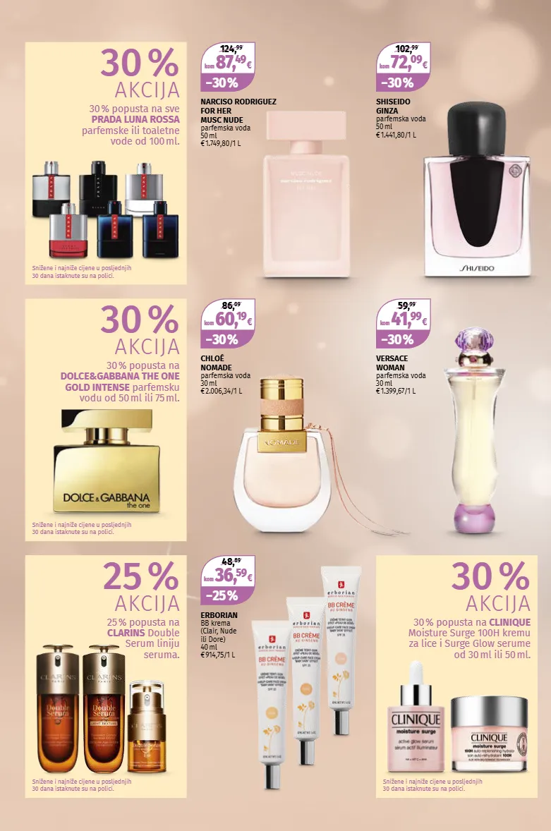 kom 72, 09 € − 30 % 102, 99 kom 87, 49 € − 30 % 124, 99 kom 41, 99 € − 30 % 59, 99 kom 60, 19 € − 30 % 86, 09 kom 36, 59 € − 25 % 48, 89 Snižene i najniže cijene u posljednjih 30 dana istaknute su na polici. Snižene i najniže cijene u posljednjih 30 dana istaknute su na polici. Snižene i najniže cijene u posljednjih 30 dana istaknute su na polici. SHISEIDO GINZA parfemska voda 50 ml € 1.441,80 / 1 L VERSACE WOMAN parfemska voda 30 ml € 1.399,67 / 1 L CHLOÉ NOMADE parfemska voda 30 ml € 2.006,34 / 1 L ERBORIAN BB krema (Clair, Nude ili Dore) 40 ml € 914,75 / 1 L NARCISO RODRIGUEZ FOR HER MUSC NUDE parfemska voda 50 ml € 1.749,80 / 1 L Snižene i najniže cijene u posljednjih 30 dana istaknute su na polici. 30 % AKCIJA 30 % popusta na sve PRADA LUNA ROSSA parfemske ili toaletne vode od 100 ml. 30 % AKCIJA 30 % popusta na CLINIQUE Moisture Surge 100H kremu za lice i Surge Glow serume od 30 ml ili 50 ml. 30 % AKCIJA 30 % popusta na DOLCE&GABBANA THE ONE GOLD INTENSE parfemsku vodu od 50 ml ili 75 ml. 25 % AKCIJA 25 % popusta na CLARINS Double Serum liniju seruma.