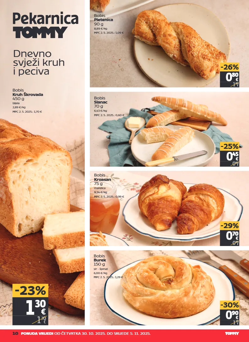 10 ponuda vrijedi od četvrtka 30. 10. 2025. do srijede 5. 11. 2025. pekarnica dnevno svježi kruh i peciva 0 70 0 99 -29% bobis burek 150 g sir - špinat 6,00 €/kg mpc 2. 5. 2025.: 1,29 € 0 90 1 29 -30% bobis slanac 70 g 6,43 €/kg mpc 2. 5. 2025.: 0,60 € 0 45 0 60 -25% bobis kruh škrovada 450 g bijela 2,89 €/kg mpc 2. 5. 2025.: 1,70 € 1 30 1 70 -23% bobis pletenica 90 g 8,89 €/kg mpc 2. 5. 2025.: 1,09 € 0 80 1 09 -26% bobis kroasan 75 g marelica 9,34 €/kg mpc 2. 5. 2025.: 0,99 €