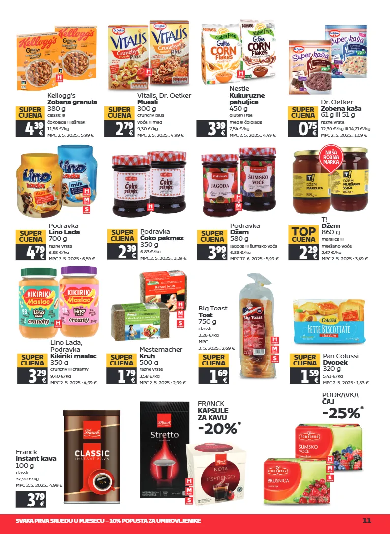 svaka prva srijedu u mjesecu – 10% popusta za umirovljenike 11 vitalis, dr. oetker muesli 300 g crunchy plus voće ili med 9,30 €/kg mpc 2. 5. 2025.: 4,99 € 2 79 super cijena podravka čoko pekmez 350 g 6,83 €/kg mpc 2. 5. 2025.: 3,29 € 2 39 super cijena podravka džem 580 g jagoda ili šumsko voće 6,88 €/kg mpc 17. 6. 2025.: 5,99 € 3 99 super cijena big toast tost 750 g classic 2,26 €/kg mpc 2. 5. 2025.: 2,69 € 1 69 super cijena pan colussi dvopek 320 g 5,43 €/kg mpc 2. 5. 2025.: 1,83 € 1 59 super cijena podravka čaj -25% * franck instant kava 100 g classic 37,90 €/kg mpc 2. 5. 2025.: 4,99 € 3 79 franck kapsule za kavu -20% * lino lada, podravka kikiriki maslac 350 g crunchy ili creamy 9,40 €/kg mpc 2. 5. 2025.: 4,99 € 3 29 super cijena mestemacher kruh 500 g razne vrste 3,58 €/kg mpc 2. 5. 2025.: 2,99 € 1 79 super cijena podravka lino lada 700 g razne vrste 6,85 €/kg mpc 2. 5. 2025.: 6,59 € 4 79 super cijena kellogg’s zobena granula 380 g classic ili čokolada i lješnjak 11,56 €/kg mpc 2. 5. 2025.: 5,99 € 4 39 super cijena nestle kukuruzne pahuljice 450 g gluten free med ili čololada 7,54 €/kg mpc 2. 5. 2025.: 4,49 € 3 39 t! džem 860 g marelica ili miješano voće 2,67 €/kg mpc 2. 5. 2025.: 3,69 € 2 29 top cijena dr. oetker zobena kaša 61 g ili 51 g razne vrste 12,30 €/kg ili 14,71 €/kg mpc 2. 5. 2025.: 1,09 € 0 75 super cijena