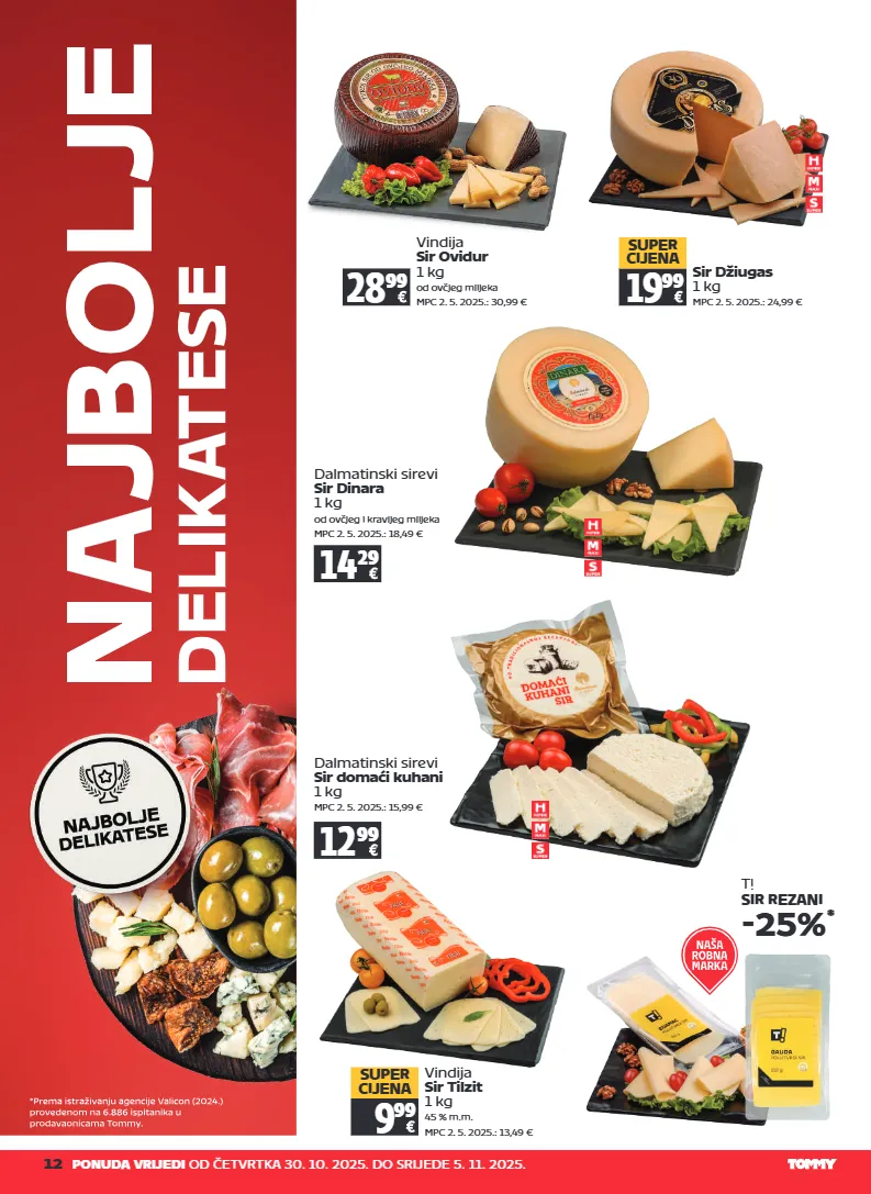 12 ponuda vrijedi od četvrtka 30. 10. 2025. do srijede 5. 11. 2025. vindija sir ovidur 1 kg od ovčjeg mlijeka mpc 2. 5. 2025.: 30,99 € 28 99 sir džiugas 1 kg mpc 2. 5. 2025.: 24,99 € 19 99 super cijena dalmatinski sirevi sir dinara 1 kg od ovčjeg i kravljeg mlijeka mpc 2. 5. 2025.: 18,49 € 14 29 dalmatinski sirevi sir domaći kuhani 1 kg mpc 2. 5. 2025.: 15,99 € 12 99 vindija sir tilzit 1 kg 45 % m.m. mpc 2. 5. 2025.: 13,49 € 9 99 super cijena t! sir rezani -25% *