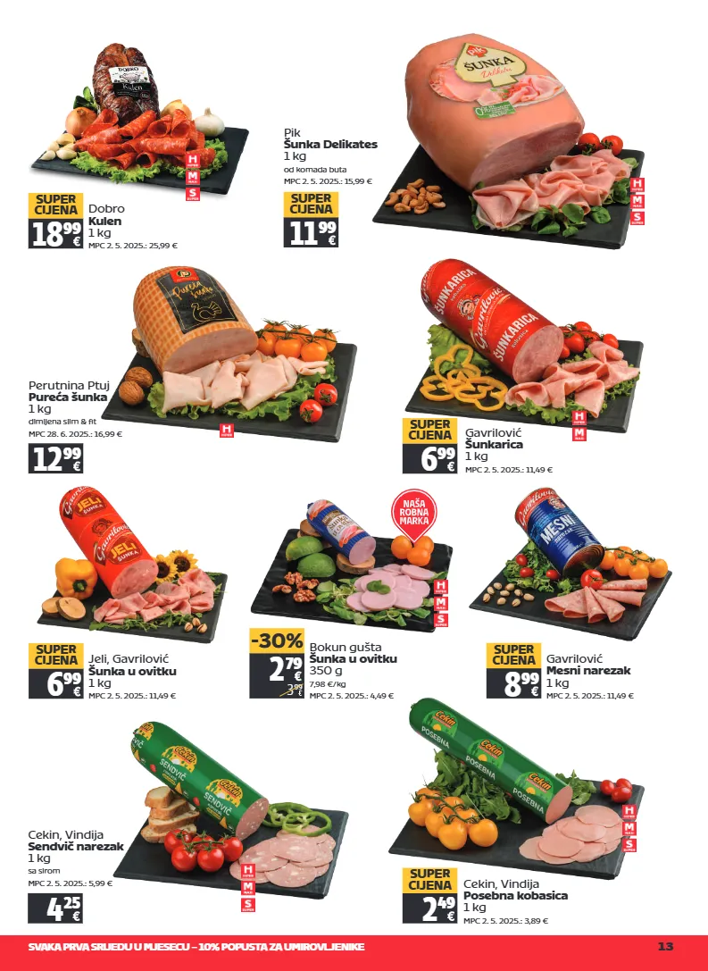 svaka prva srijedu u mjesecu – 10% popusta za umirovljenike 13 gavrilović šunkarica 1 kg mpc 2. 5. 2025.: 11,49 € 6 99 super cijena jeli, gavrilović šunka u ovitku 1 kg mpc 2. 5. 2025.: 11,49 € 6 99 super cijena gavrilović mesni narezak 1 kg mpc 2. 5. 2025.: 11,49 € 8 99 super cijena cekin, vindija sendvič narezak 1 kg sa sirom mpc 2. 5. 2025.: 5,99 € 4 25 cekin, vindija posebna kobasica 1 kg mpc 2. 5. 2025.: 3,89 € 2 49 super cijena dobro kulen 1 kg mpc 2. 5. 2025.: 25,99 € 18 99 super cijena pik šunka delikates 1 kg od komada buta mpc 2. 5. 2025.: 15,99 € 11 99 super cijena 2 79 3 99 -30% bokun gušta šunka u ovitku 350 g 7,98 €/kg mpc 2. 5. 2025.: 4,49 € perutnina ptuj pureća šunka 1 kg dimljena slim & fit mpc 28. 6. 2025.: 16,99 € 12 99