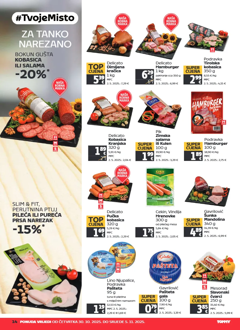 14 ponuda vrijedi od četvrtka 30. 10. 2025. do srijede 5. 11. 2025. delicato pučka kobasica 320 g 5,29 €/kg mpc 2. 5. 2025.: 2,29 € 1 69 top cijena za tanko narezano bokun gušta kobasica ili salama -20% * slim & fit, perutnina ptuj pileća ili pureća prsa narezak -15% * delicato dimljena kračica 1 kg mpc 2. 5. 2025.: 7,29 € 5 39 top cijena pik zimska salama ili kulen 100 g 19,90 €/kg mpc 2. 5. 2025.: 3,29 € 1 99 super cijena 6 29 6 99 delicato hamburger 1 kg pakiranje cca 350 g mpc 2. 5. 2025.: 6,99 € podravka hamburger 100 g 18,90 €/kg mpc 2. 5. 2025.: 2,75 € 1 89 super cijena podravka tirolska kobasica 350 g 8,55 €/kg mpc 2. 5. 2025.: 4,15 € 2 99 super cijena cekin, vindija hrenovke 300 g od pilećeg mesa 5,84 €/kg mpc 2. 5. 2025.: 2,05 € 1 75 gavrilović šunka mandolina 340 g 14,39 €/kg mpc 2. 5. 2025.: 6,99 € 4 89 super cijena mesorad slavonski čvarci 250 g 15,40 €/kg mpc 2. 5. 2025.: 5,99 € 3 85 super cijena lino njupalice, podravka pašteta 95 g tuna ili piletina s mliječnim namazom 12,53 €/kg mpc 2. 5. 2025.: 2,29 € ili 1,69 € 1 19 gavrilović pašteta gala 100 g 7,90 €/kg mpc 2. 5. 2025.: 1,19 € 0 79 super cijena 1 89 2 04 delicato kobasica kranjska 320 g 5,91 €/kg mpc 2. 5. 2025.: 2,04 €