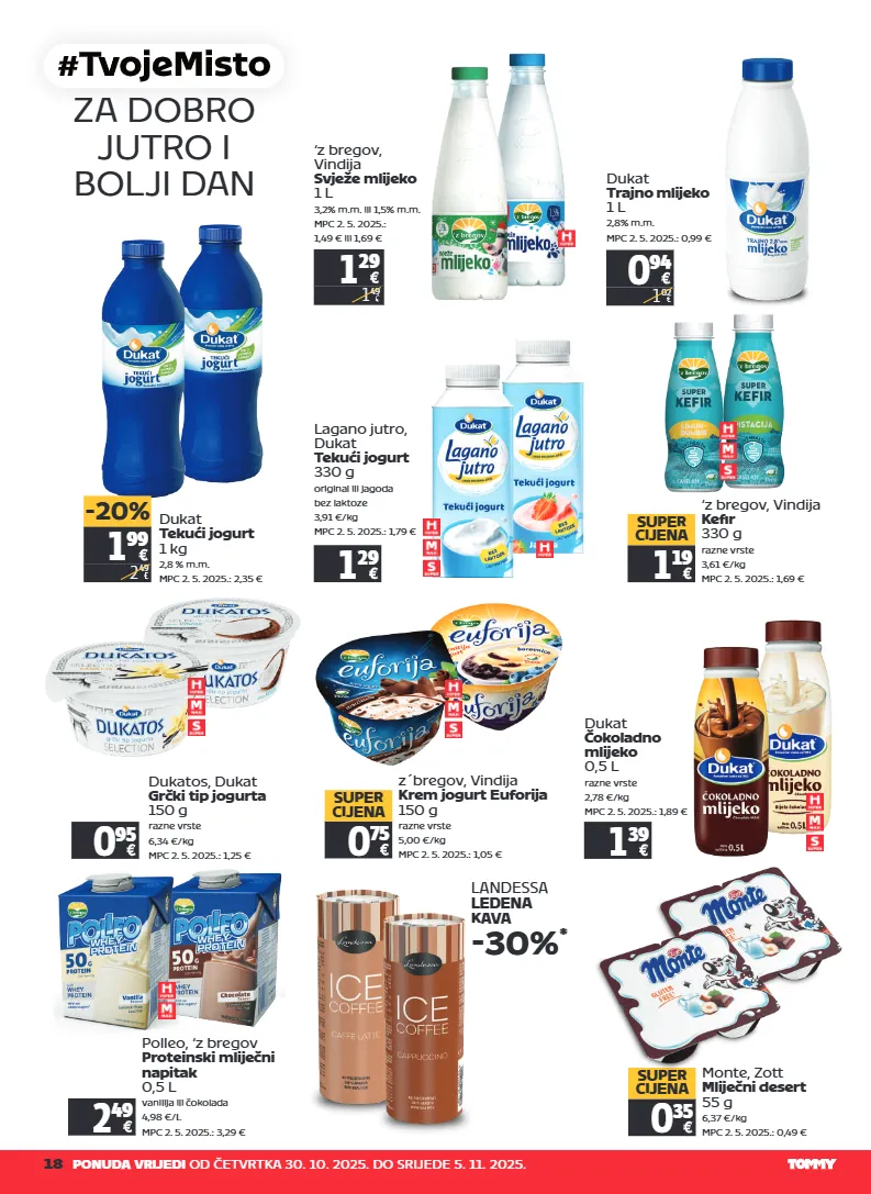 18 ponuda vrijedi od četvrtka 30. 10. 2025. do srijede 5. 11. 2025. za dobro jutro i bolji dan 0 94 1 02 dukat trajno mlijeko 1 l 2,8% m.m. mpc 2. 5. 2025.: 0,99 € ‘z bregov, vindija kefir 330 g razne vrste 3,61 €/kg mpc 2. 5. 2025.: 1,69 € 1 19 super cijena lagano jutro, dukat tekući jogurt 330 g original ili jagoda bez laktoze 3,91 €/kg mpc 2. 5. 2025.: 1,79 € 1 29 dukat tekući jogurt 1 kg 2,8 % m.m. mpc 2. 5. 2025.: 2,35 € 0 95 dukatos, dukat grčki tip jogurta 150 g razne vrste 6,34 €/kg mpc 2. 5. 2025.: 1,25 € 0 75 super cijena z´bregov, vindija krem jogurt euforija 150 g razne vrste 5,00 €/kg mpc 2. 5. 2025.: 1,05 € dukat čokoladno mlijeko 0,5 l razne vrste 2,78 €/kg mpc 2. 5. 2025.: 1,89 € 1 39 polleo, ‘z bregov proteinski mliječni napitak 0,5 l vanilija ili čokolada 4,98 €/l mpc 2. 5. 2025.: 3,29 € 2 49 landessa ledena kava -30% * monte, zott mliječni desert 55 g 6,37 €/kg mpc 2. 5. 2025.: 0,49 € 0 35 super cijena 1 29 1 49 ‘z bregov, vindija svježe mlijeko 1 l 3,2% m.m. ili 1,5% m.m. mpc 2. 5. 2025.: 1,49 € ili 1,69 € 1 99 2 49 -20%