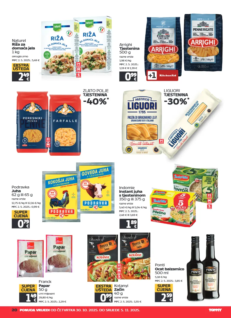20 20 ponuda vrijedi od četvrtka 30. 10. 2025. do srijede 5. 11. 2025. naturel riža za domaća jela 1 kg okruglo zrno mpc 2. 5. 2025.: 5,49 € 2 49 ekstra ušteda zlato polje tjestenina -40% * podravka juha 62 g ili 65 g razne vrste 12,75 €/kg ili 12,16 €/kg mpc 2. 5. 2025.: 0,99 € 0 79 super cijena 1 89 indomie instant juha s tjesteninom 350 g ili 375 g razne vrste 5,40 €/kg ili 5,04 €/kg mpc 2. 5. 2025.: 2,49 € ili 3,69 € franck papar 50 g crni mljeveni 29,80 €/kg mpc 2. 5. 2025.: 2,29 € 1 49 super cijena ponti ocat balzamico 500 ml 5,18 €/kg mpc 2. 5. 2025.: 3,85 € 2 59 super cijena arrighi tjestenina 500 g razne vrste 1,98 €/kg mpc 2. 5. 2025.: 1,19 € ili 1,39 € 0 99 kotanyi začin 40 g razne vrste mpc 2. 5. 2025.: 1,55 € 0 99 ekstra ušteda liguori tjestenina -30% *