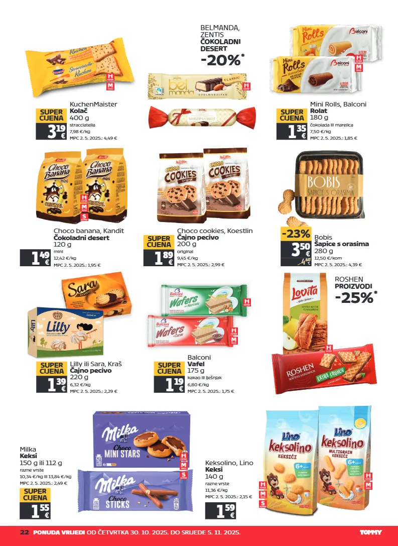 22 ponuda vrijedi od četvrtka 30. 10. 2025. do srijede 5. 11. 2025. belmanda, zentis čokoladni desert -20% * mini rolls, balconi rolat 180 g čokolada ili marelica 7,50 €/kg mpc 2. 5. 2025.: 1,85 € 1 35 super cijena lilly ili sara, kraš čajno pecivo 220 g 6,32 €/kg mpc 2. 5. 2025.: 2,29 € 1 39 super cijena balconi vafel 175 g kakao ili lješnjak 6,80 €/kg mpc 2. 5. 2025.: 1,75 € 1 19 super cijena roshen proizvodi -25% * milka keksi 150 g ili 112 g razne vrste 10,34 €/kg ili 13,84 €/kg mpc 2. 5. 2025.: 2,49 € 1 55 super cijena choco banana, kandit čokoladni desert 120 g mini 12,42 €/kg mpc 2. 5. 2025.: 1,95 € 1 49 choco cookies, koestlin čajno pecivo 200 g original 9,45 €/kg mpc 2. 5. 2025.: 2,99 € 1 89 super cijena 3 50 4 60 -23% bobis šapice s orasima 280 g 12,50 €/kom mpc 2. 5. 2025.: 4,39 € 3 19 super cijena kuchenmaister kolač 400 g stracciatella 7,98 €/kg mpc 2. 5. 2025.: 4,49 € keksolino, lino keksi 140 g razne vrste 11,36 €/kg mpc 2. 5. 2025.: 2,15 € 1 59