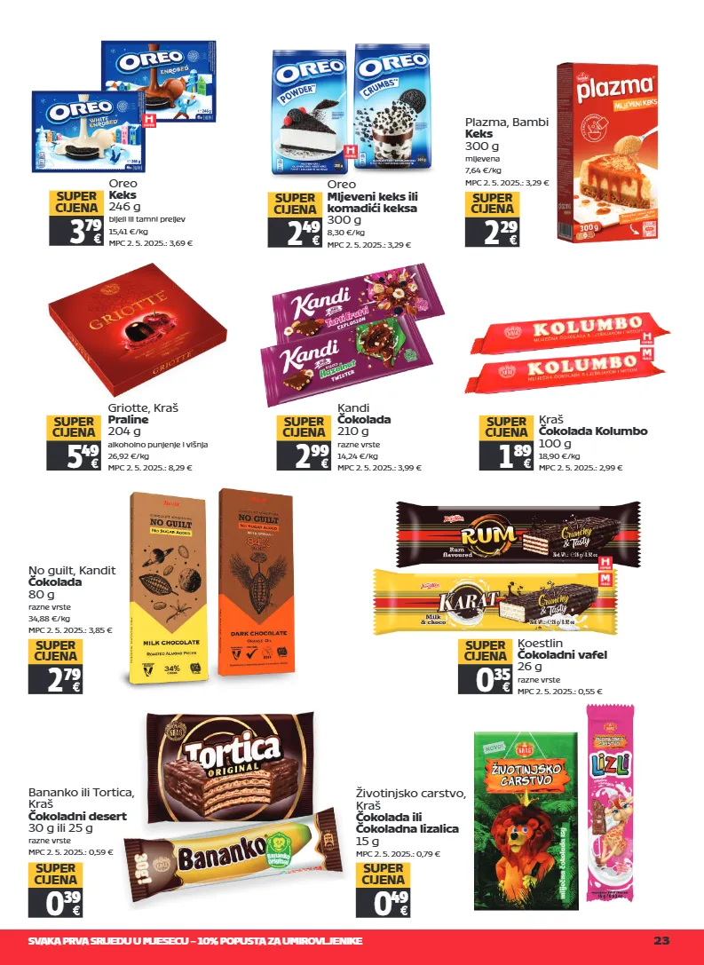 svaka prva srijedu u mjesecu – 10% popusta za umirovljenike 23 kandi čokolada 210 g razne vrste 14,24 €/kg mpc 2. 5. 2025.: 3,99 € 2 99 super cijena kraš čokolada kolumbo 100 g 18,90 €/kg mpc 2. 5. 2025.: 2,99 € 1 89 super cijena koestlin čokoladni vafel 26 g razne vrste mpc 2. 5. 2025.: 0,55 € 0 35 super cijena životinjsko carstvo, kraš čokolada ili čokoladna lizalica 15 g mpc 2. 5. 2025.: 0,79 € 0 49 super cijena oreo mljeveni keks ili komadići keksa 300 g 8,30 €/kg mpc 2. 5. 2025.: 3,29 € 2 49 super cijena no guilt, kandit čokolada 80 g razne vrste 34,88 €/kg mpc 2. 5. 2025.: 3,85 € 2 79 super cijena plazma, bambi keks 300 g mljevena 7,64 €/kg mpc 2. 5. 2025.: 3,29 € 2 29 super cijena oreo keks 246 g bijeli ili tamni preljev 15,41 €/kg mpc 2. 5. 2025.: 3,69 € 3 79 super cijena griotte, kraš praline 204 g alkoholno punjenje i višnja 26,92 €/kg mpc 2. 5. 2025.: 8,29 € 5 49 super cijena bananko ili tortica, kraš čokoladni desert 30 g ili 25 g razne vrste mpc 2. 5. 2025.: 0,59 € 0 39 super cijena